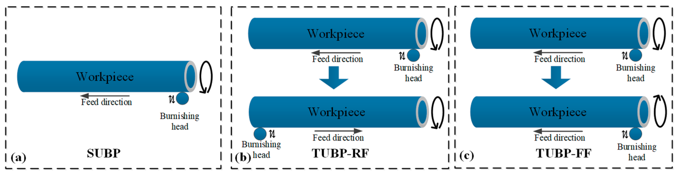 Figure 4c, the surface produced by TUBP-FF appears smoother and processes the micro-protrusions in the reverse direction. The second pass of burnishing further eliminates the micro-protrusions generated by finish turning and the first pass of ultrasonic burnishing, which can better ensure the integrity of the machined surface.
