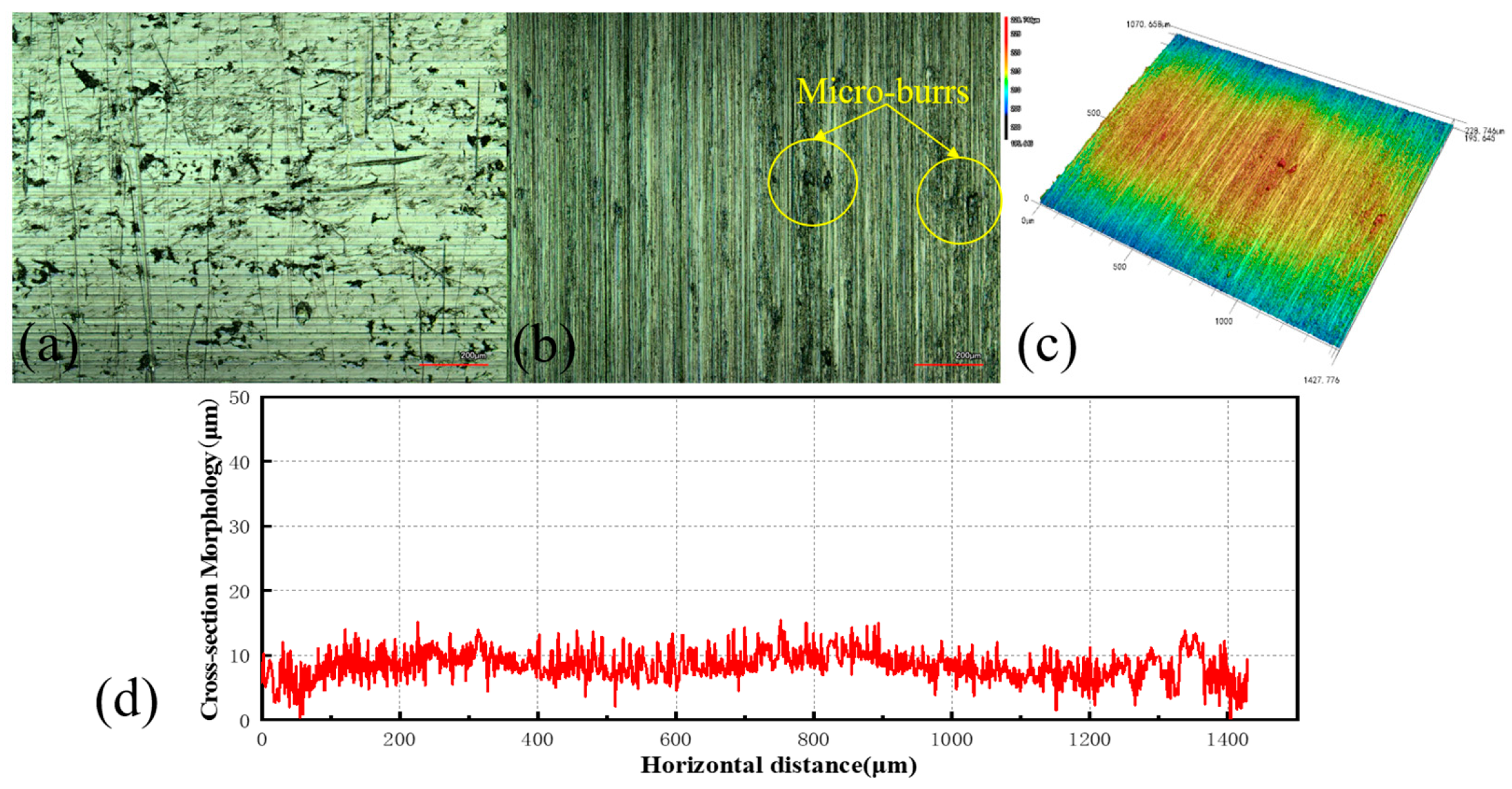 Figure 3b–d, the flatness is improved after rough turning and finish turning, but micro-protrusions and micro-burrs still exist. These micro-defects can be contributed due to severe plastic deformation between the tool flank face and the machined surface.