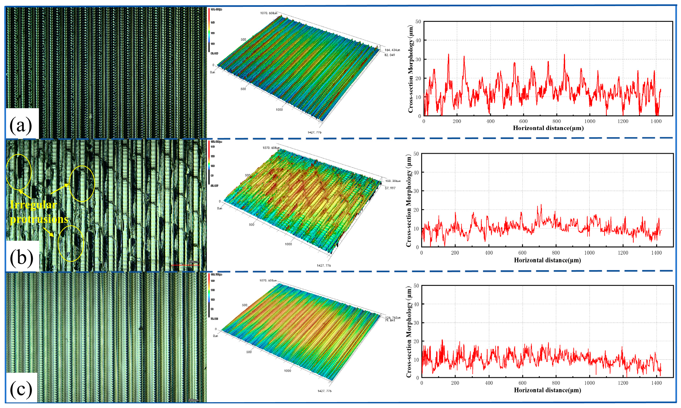 Figure 4b, the micro-textures on the surface produced by TUBP-RF transformed into two dimensions. The processing in two different feed directions makes the protrusions on the machined surfaces more obvious. The excessively dense impacts damage the surface, and the resulting surface protrusions are too messy. This is because the regular grooves and hardened layer formed during the first burnishing process are subjected to plastic stress in different directions during the second reverse burnishing. When the stress paths of the two deformations are misaligned, stress concentration and material pile-up are prone to occur on the surface, leading to the formation of disordered two-dimensional protrusions. As shown in