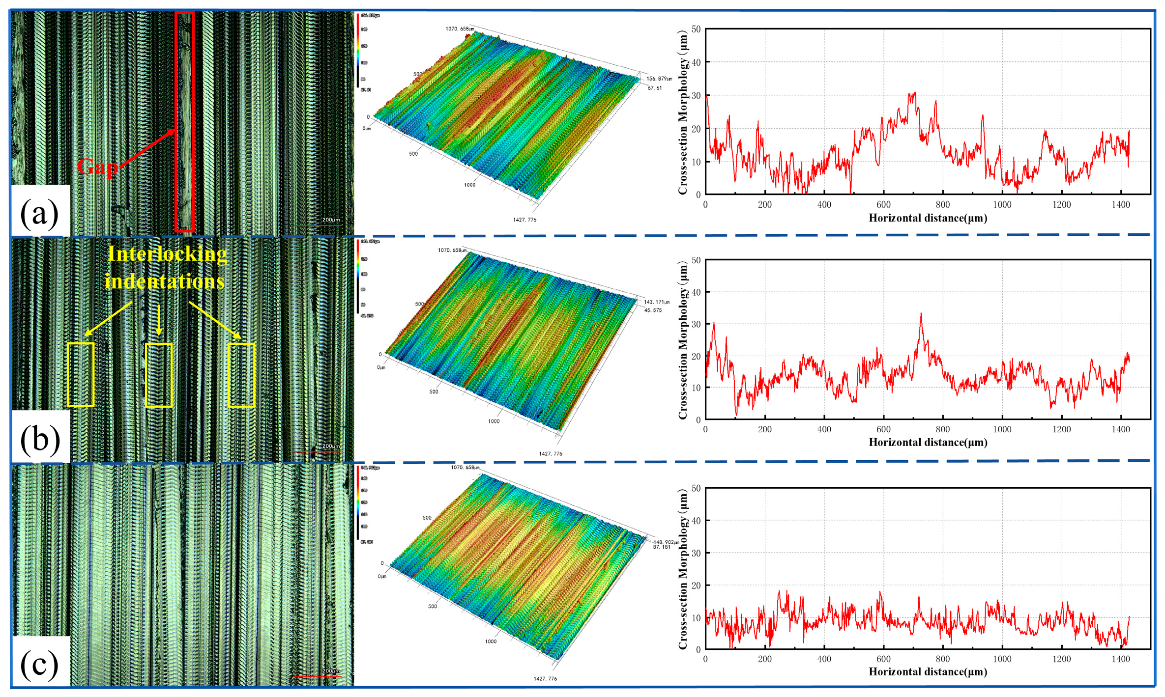 Figure 6c, due to the high overlap between the two passes, the surface is macroscopically the smoothest and most uniform, with a relatively low overall height and gentle fluctuations in the profile curve. However, a significant gap area still exists after two passes at a high feed. As a result, the TUBP-FF surface forms a composite morphology of alternating burnished and un-machined zones. Although this morphology has small fluctuations, the presence of a large hydrophilic gap and the low average curvature of the peak are actually detrimental to improving hydrophobic properties.