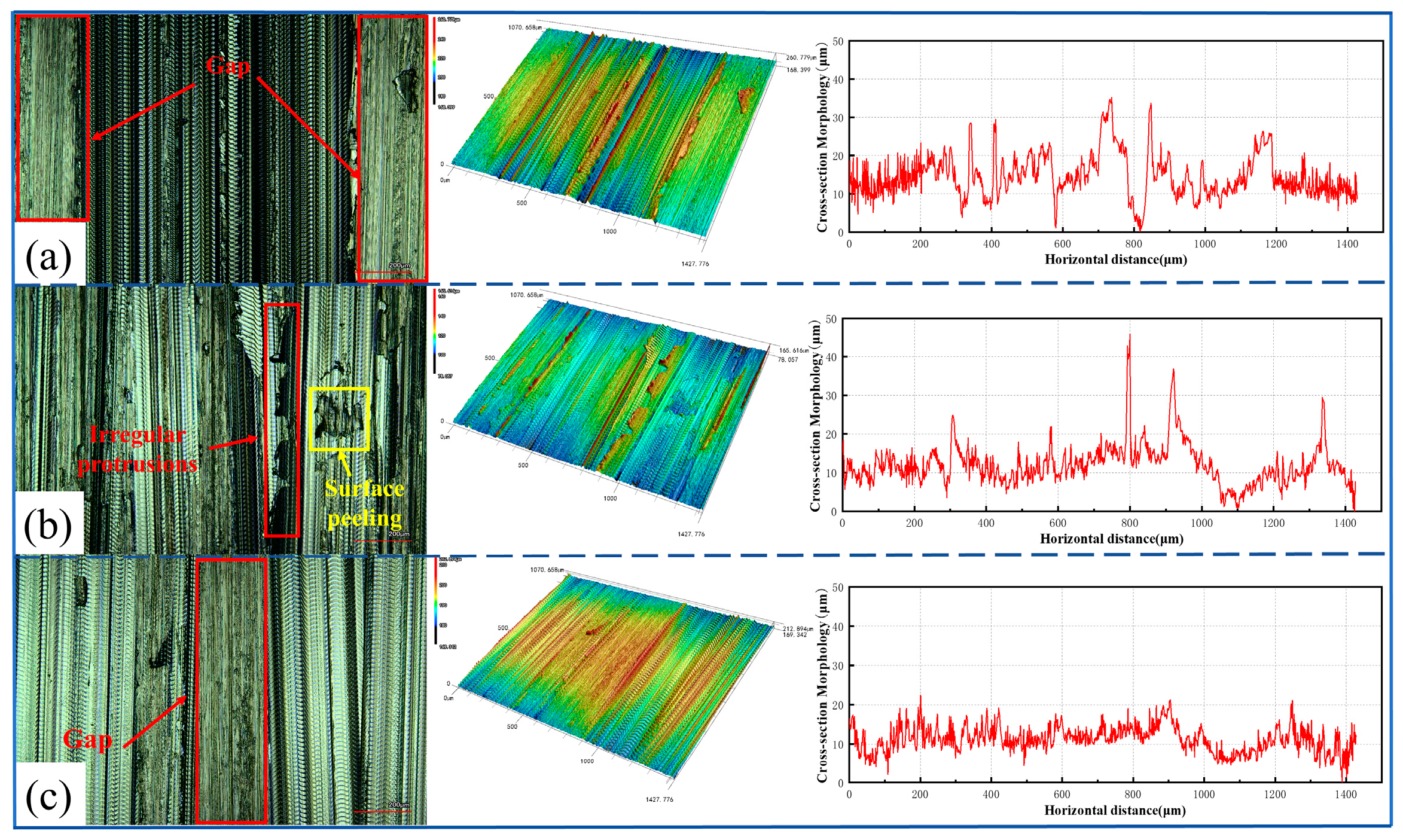 Figure 5a, the groove spacing generated by the burnishing balls is larger when the feed rate is increased to 0.7 mm/r. It is noteworthy that under these processing parameters, the machined surface begins to show unfinished surfaces, i.e., gaps, thus affecting the uniformity of the surface morphology. This is because in SUBP, surface integrity depends on the relationship between the effective indentation width of the burnishing tool and the feed rate. When the feed rate exceeds the effective plastic deformation width of the burnishing ball on the material, regions of material not subjected to plastic deformation, i.e., gaps, will appear between adjacent burnishing trajectories. In undeformed areas, the original state or the post-finish turning morphology is retained, leading to a decrease in surface uniformity. As shown in
