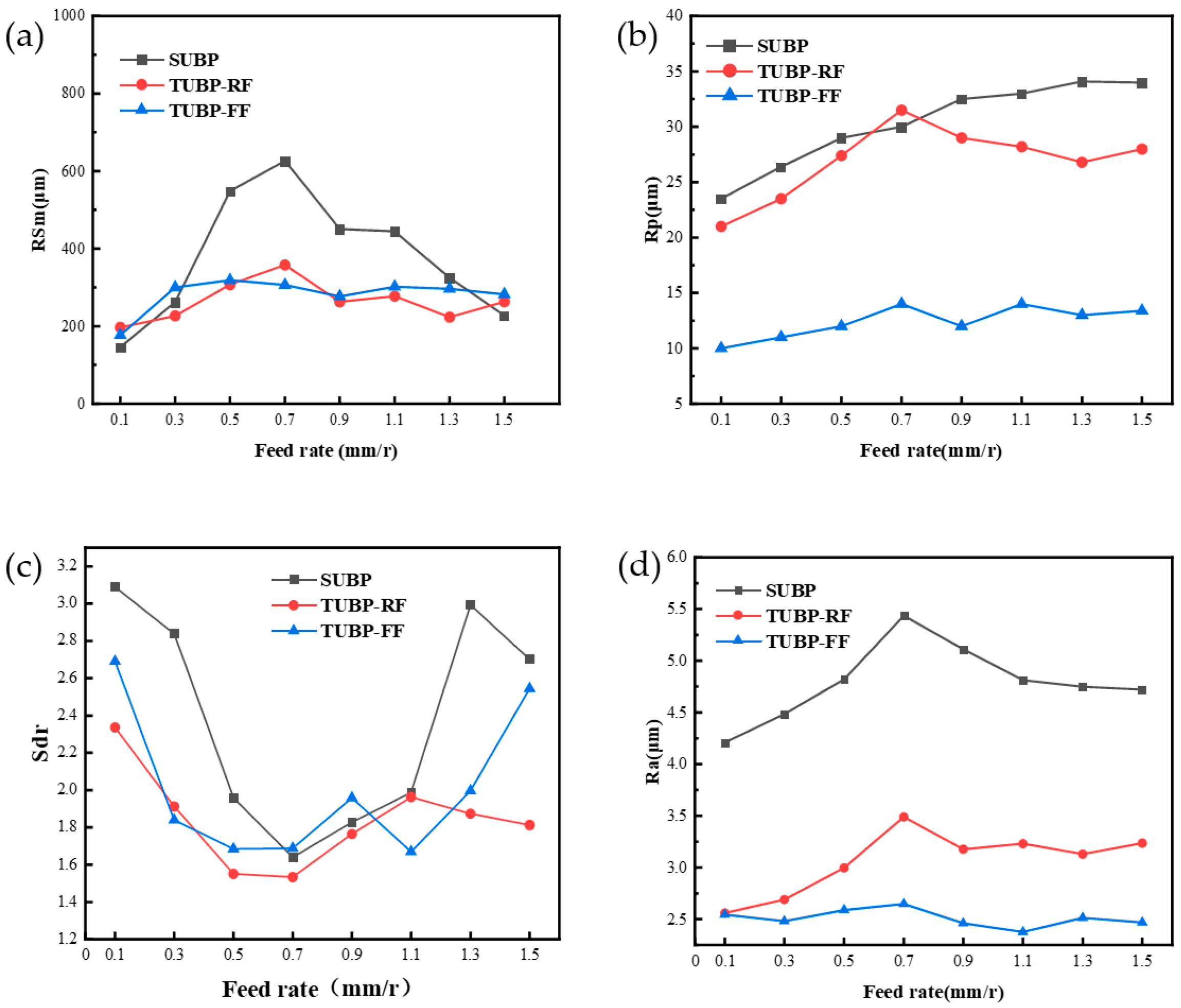 Figure 7b, all three sets of curves generally show an upward trend with increasing feed rate. In the SUBP at low feed rates, the burnishing trajectory overlap is high, resulting in a significant material accumulation effect, forming deep grooves and high protrusions, thus leading to a large average peak–valley height difference. After the gap appears, the peak–valley height difference gradually reaches a high level and tends to flatten out. Furthermore, the increasing feed rate leads to a gradual increase in tangential force, resulting in a slow increase in peak height Rp. In the TUBP-RF process, the second pass has little impact on the peak–valley height difference at low feed rates. However, with increasing feed rate, the second-pass burnishing process further compresses the protrusions formed in the first pass, producing a sharper array of protrusions and exhibiting a larger peak–valley height difference. At high feed rates, although microscopic defects may appear on the surface, this interlaced sharp texture remains relatively compact in the height direction; thus, the peak–valley height change is gradual. The TUBP-FF process, due to its smoothing effect, consistently produces the lowest and most stable peak and valley heights, with minimal surface undulations. Together with its extremely small average peak spacing RSm, it constitutes a highly homogenized three-dimensional morphological feature.