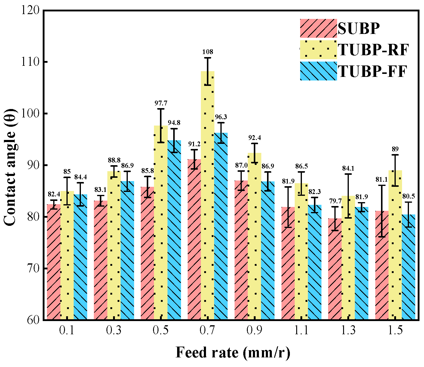 From the error analysis, different processing paths have a significant impact on the consistency and stability of the surface micro-textures. In the SUBP, when the feed rate is low, the standard deviation of the contact angle measurement is small, and the surface micro-textures formation is relatively stable. However, at high feed rates, the appearance of gaps disrupts surface integrity, leading to a significant increase in the standard deviation. This indicates that excessively high feed rates in the SUBP introduce instability into the surface micro-textures. In the TUBP-RF process, due to the reverse feed in the machining trajectory, the two feeds in different directions during micro-textures formation change the direction of surface force, resulting in poor surface morphology uniformity. Consequently, the overall error bars are generally larger than those of SUBP and TUBP-FF. In contrast, the error bars of TUBP-FF are the most convergent, indicating that the two feeds in the same direction largely offset irregular protrusions on the surface, resulting in a more uniform workpiece surface.