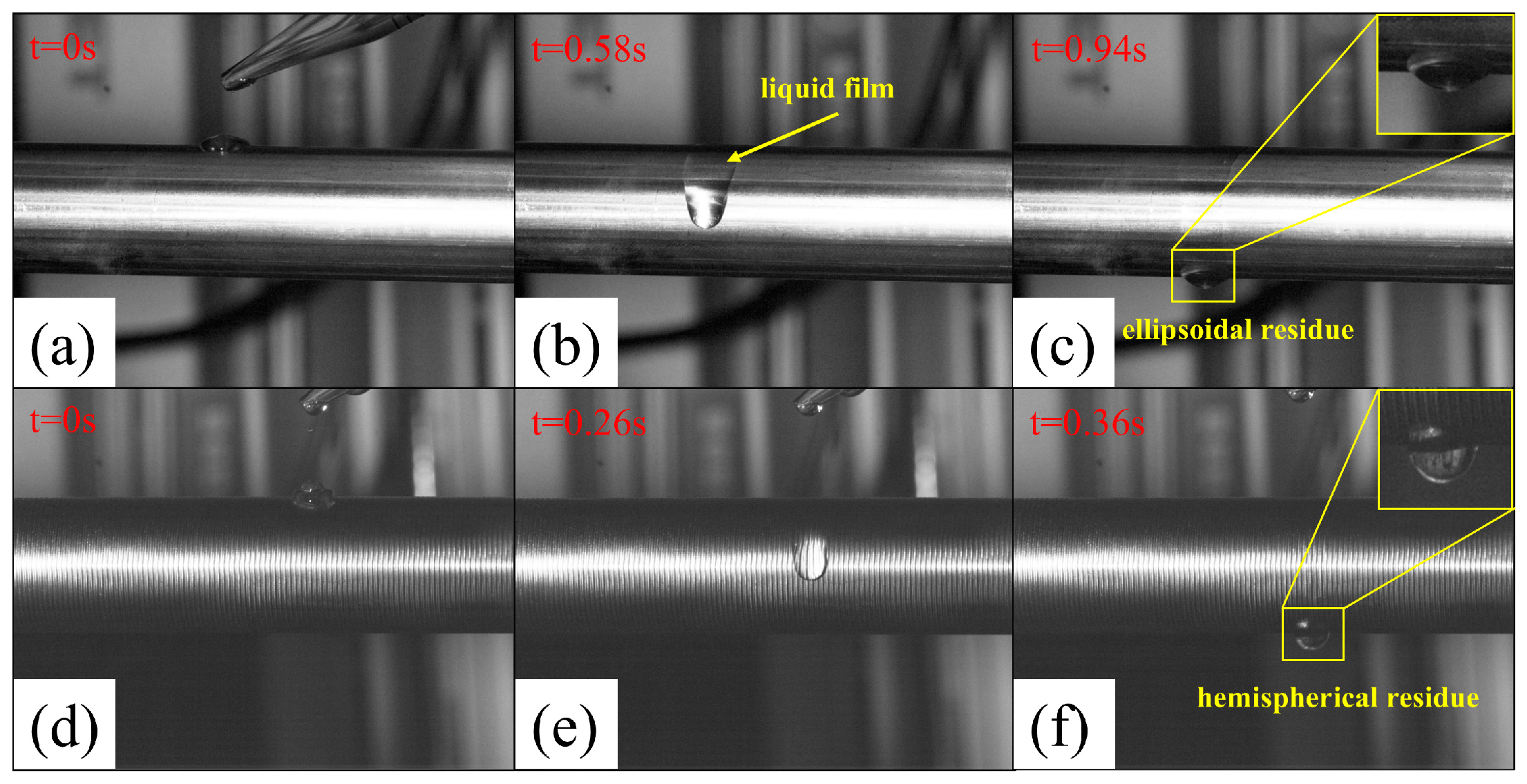 Figure 10b,e show that when the droplets slide off the original surface, a distinct liquid film remains on the workpiece surface, while the droplets on the surface after TUBP-RF treatment maintain a full droplet shape during the sliding process, and the residual droplet size is significantly lower. As shown in