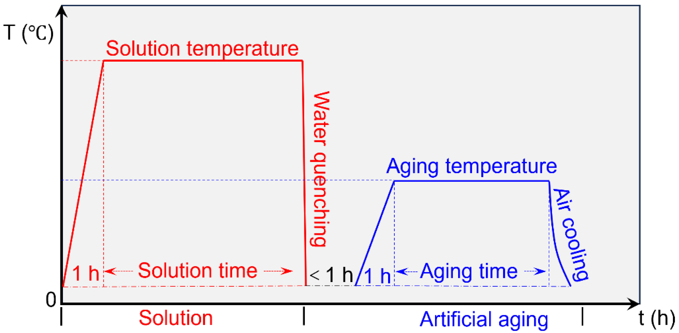 | Solution Temperature (°C) | Solution Time (h) | Aging Temperature (°C) | Aging Time (h) | ||