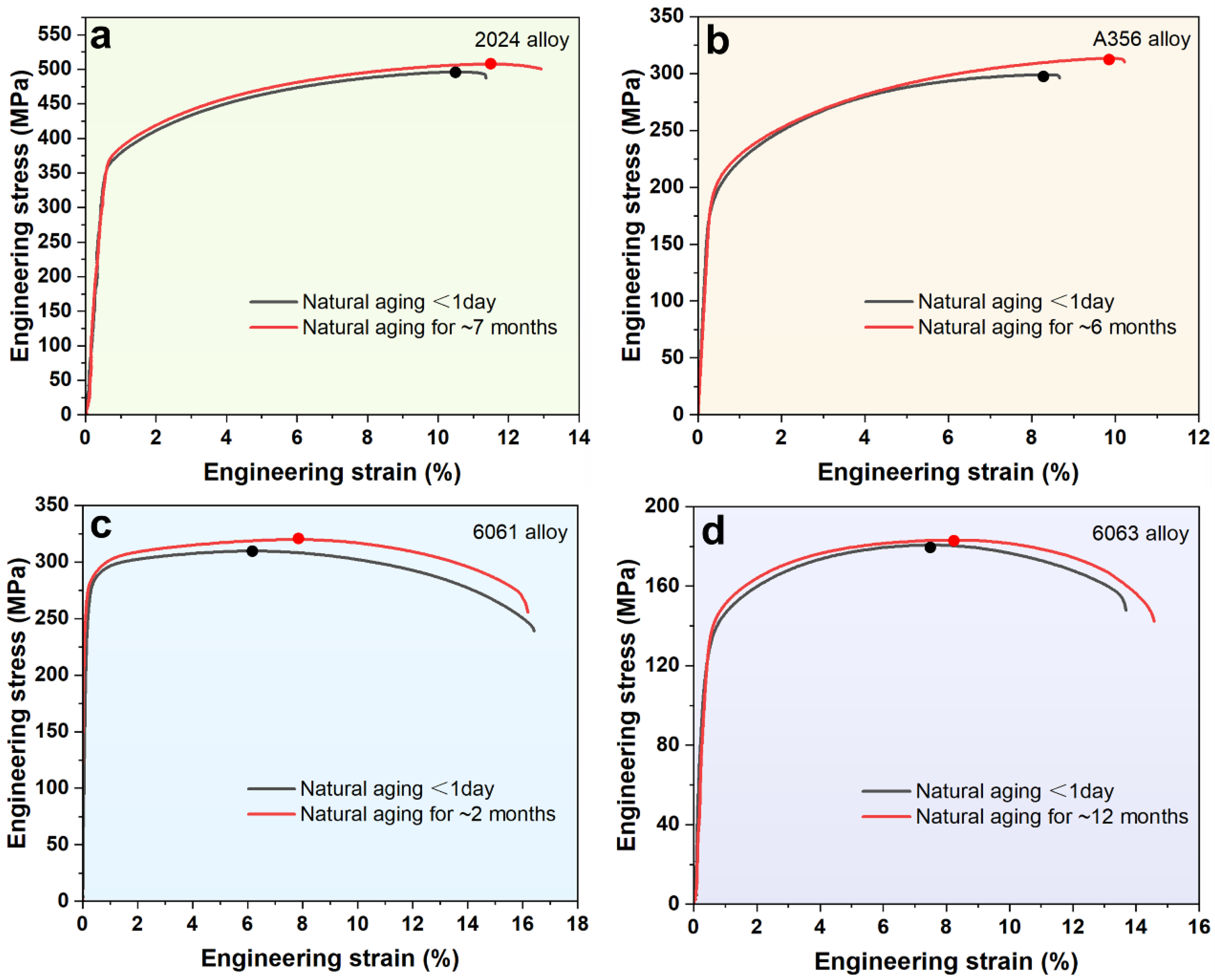 - Uniform elongation and ultimate tensile stress were increased after a long-time natural aging of T6 heat-treated 2024, A356, 6063 and 6061 Al alloys. For example, uniform elongation and ultimate tensile stress of 2024 alloy were respectively increased from 10.2% and 496.7 MPa to 11.1% and 507.5 MPa.