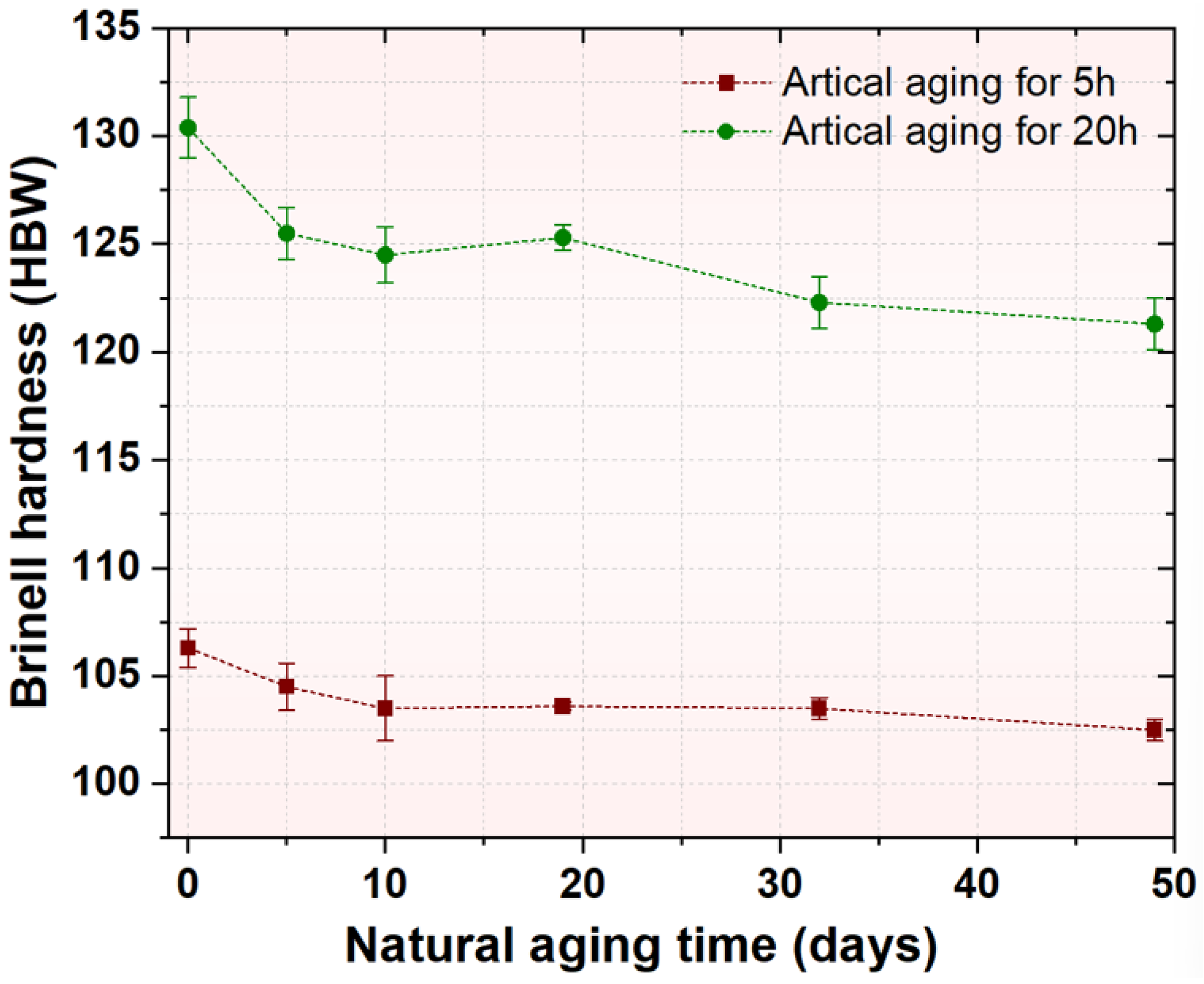 - Brinell hardness for both under- and peak-aged 2024 alloys was reduced with prolonging of the natural aging time. For example, the hardness of peak-aged 2024 alloy reduced from 130 HBW to 121 HBW after natural aging for 49 days.