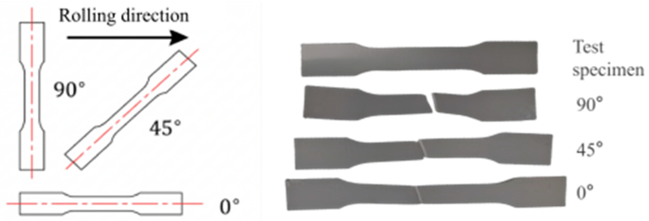 - GB/T 228.1-2021; Metallic Materials—Tensile Testing—Part 1: Test Methods at Room Temperature. China Standards Press: Beijing, China, 2021.