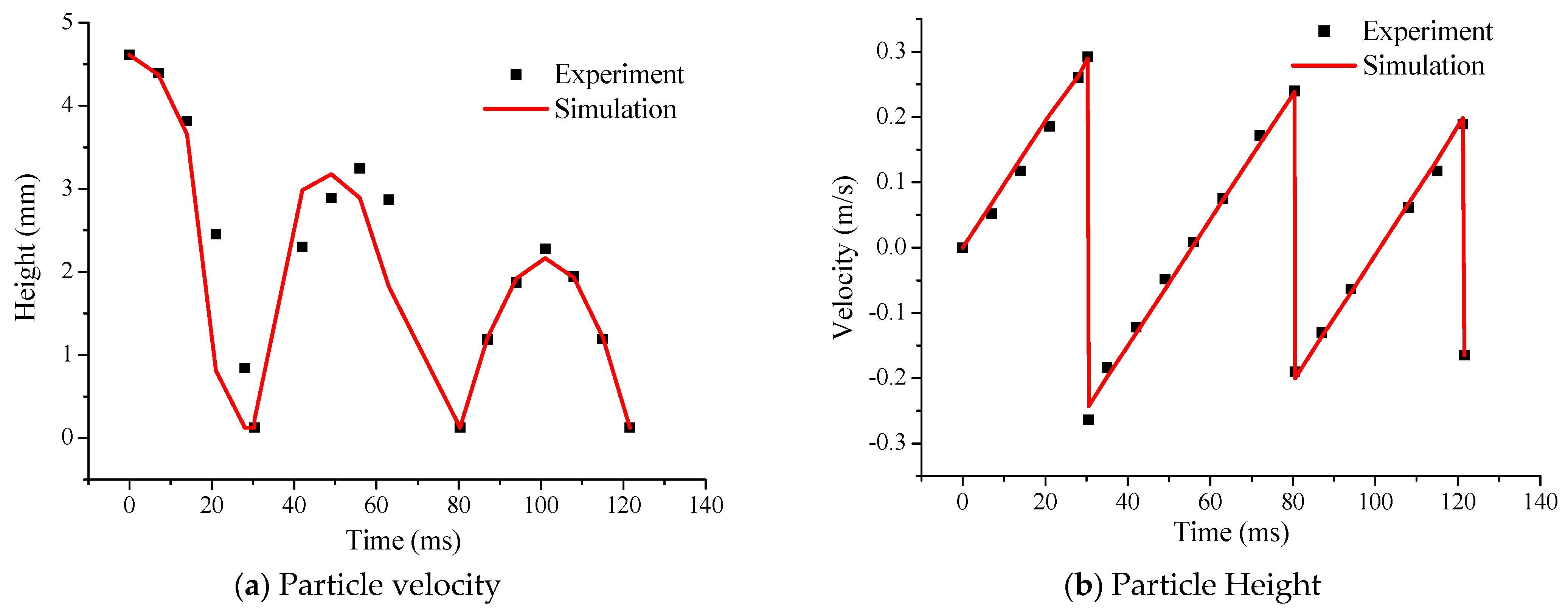 Figure 2 compares experimentally measured and numerically predicted particle height and velocity as functions of time. The quantitative agreement is assessed using estimated error metrics based on digitized data, yielding RMSE ≈ 0.06 mm and mean relative error ≈ 3.8% for particle height, and RMSE ≈ 0.012 m/s and mean relative error ≈ 5.1% for particle velocity. Based on digitized experimental data from