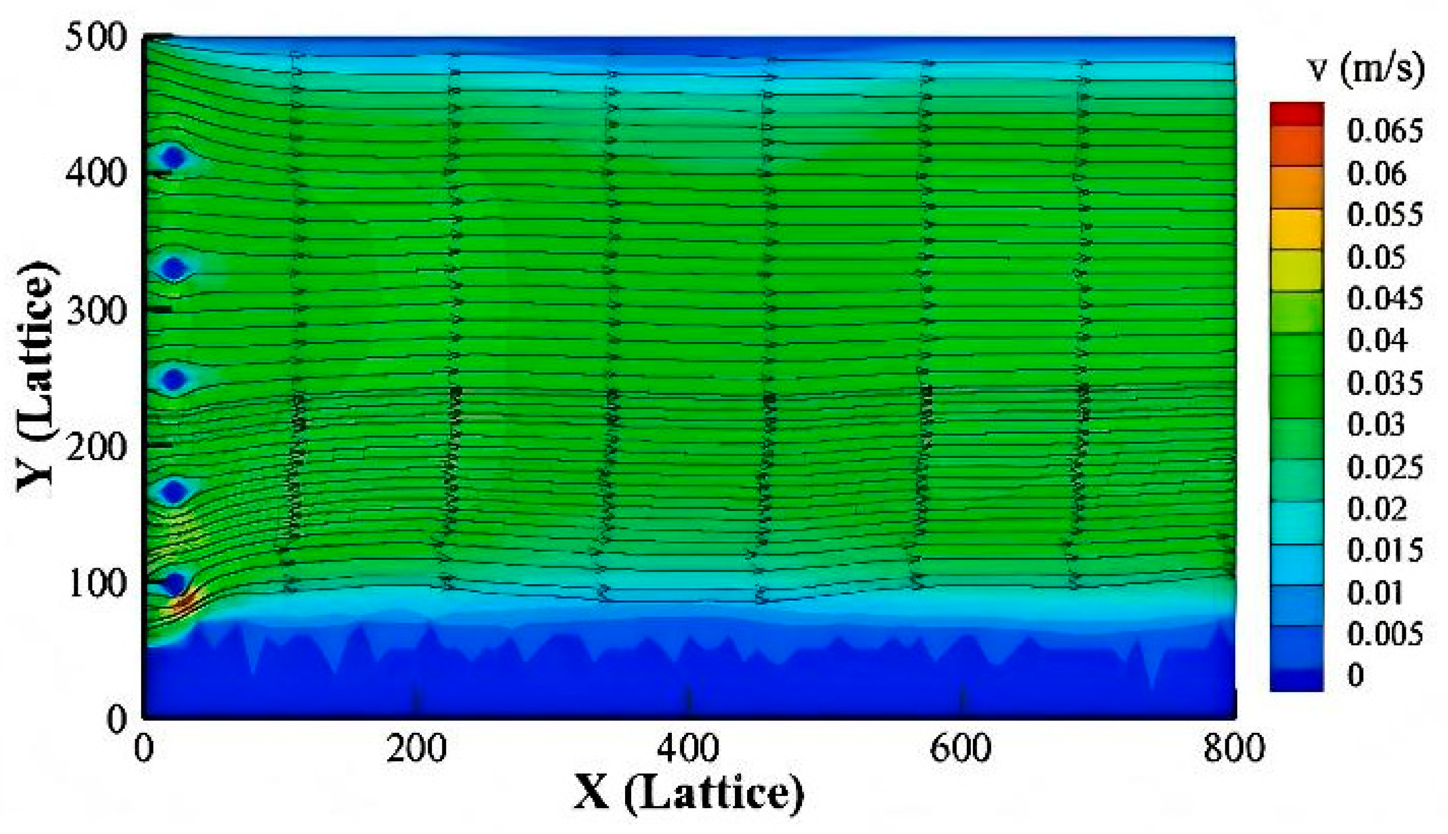 The coupled LBM–IMBM–DEM framework employed in this study was implemented using an in-house numerical solver developed in C++. The gas phase flow was resolved using the lattice Boltzmann method with a standard D2Q9 lattice model, which is suitable for incompressible, low-Mach-number flows. Particle motion was simulated using the discrete element method (DEM), while the immersed boundary method (IMBM) was used to enforce fluid–solid coupling between the gas flow, particles, and rough surface structures.