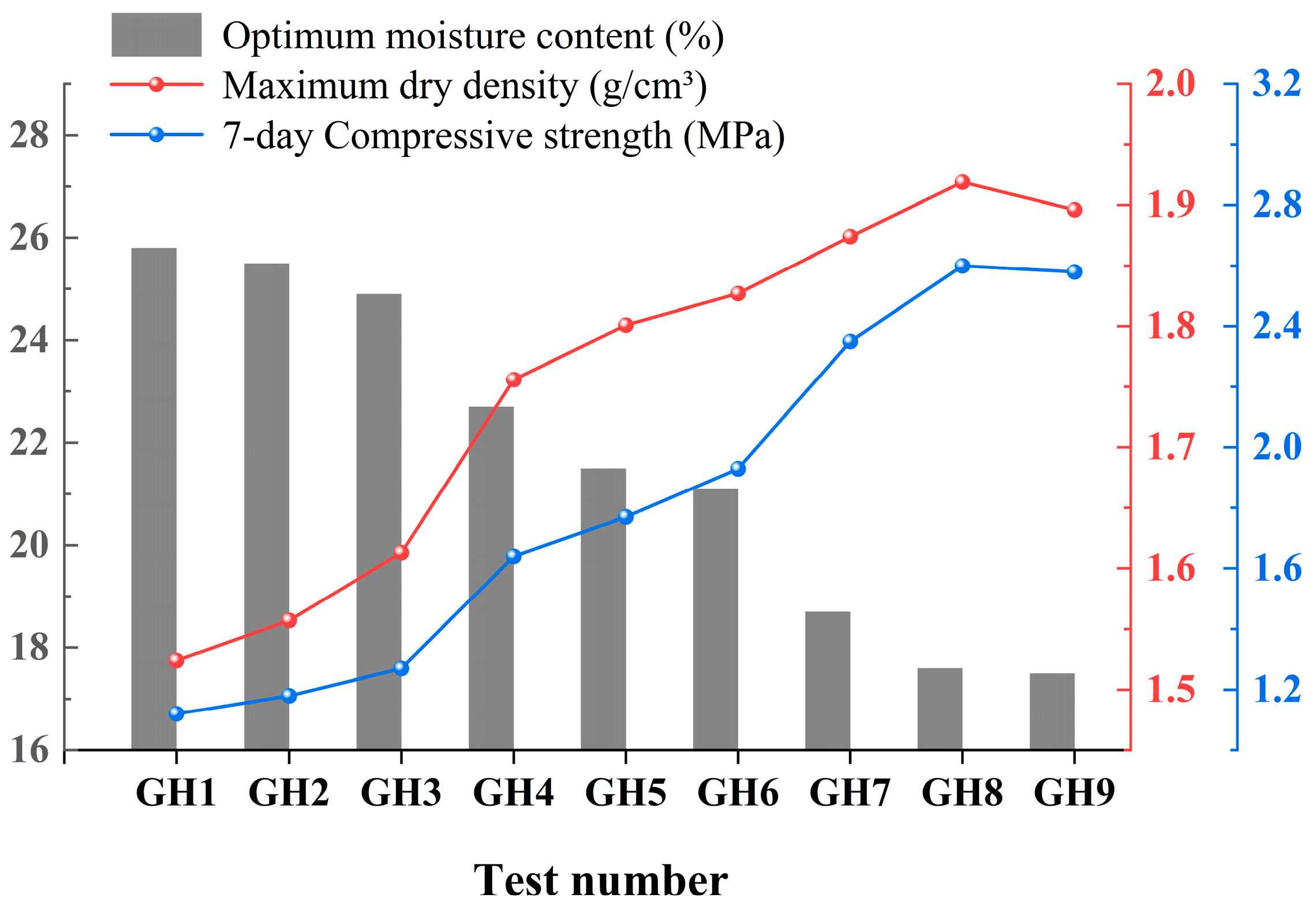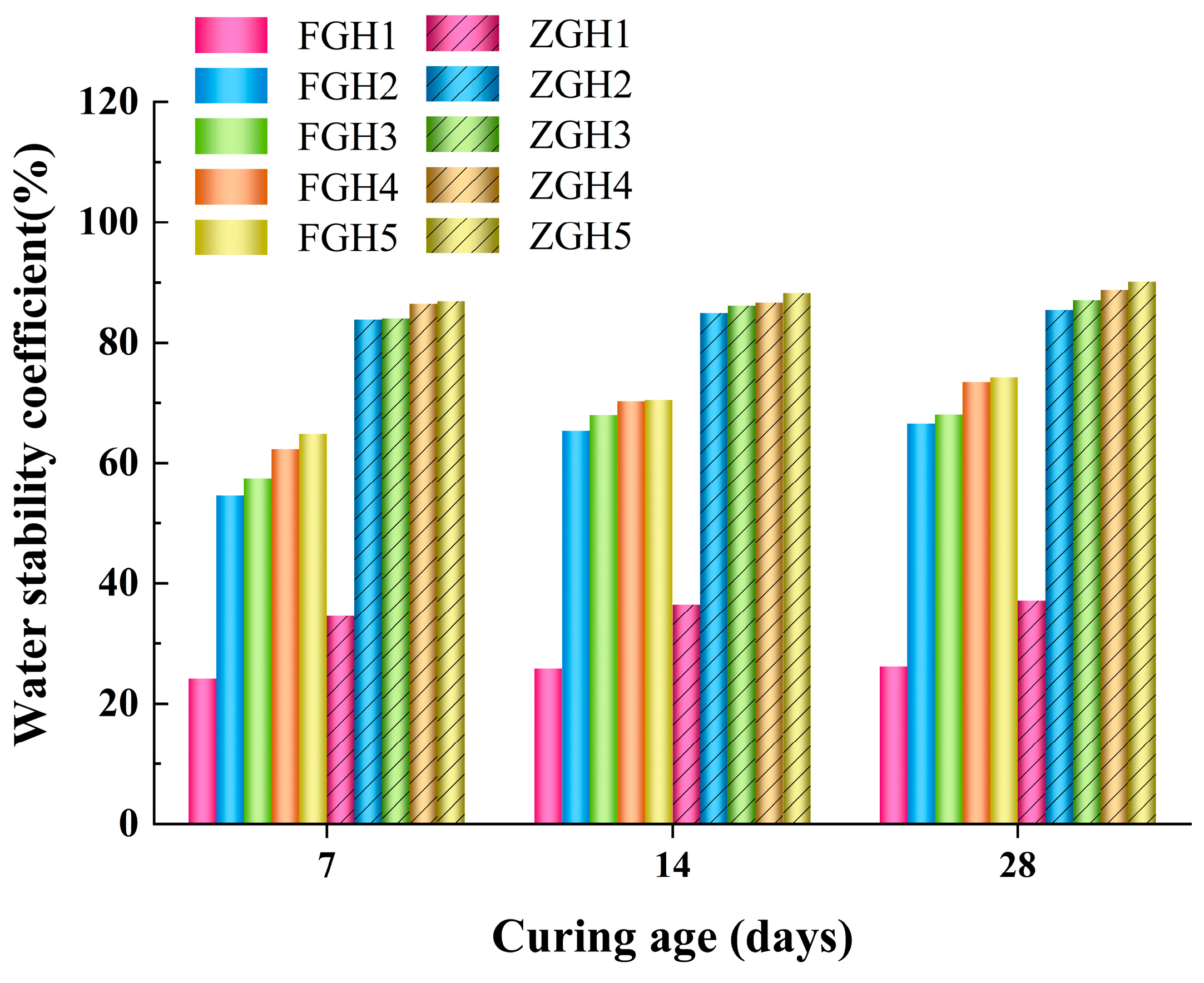 Table 7. A group of specimens was cured under standard curing conditions (temperature 20 °C ± 2 °C, humidity ≥ 95%), and then unconfined compressive strength tests were carried out. Another group of specimens was cured under the same standard curing conditions until the last day and then taken out and immersed in water for 24 h before undergoing an unconfined compressive strength test.