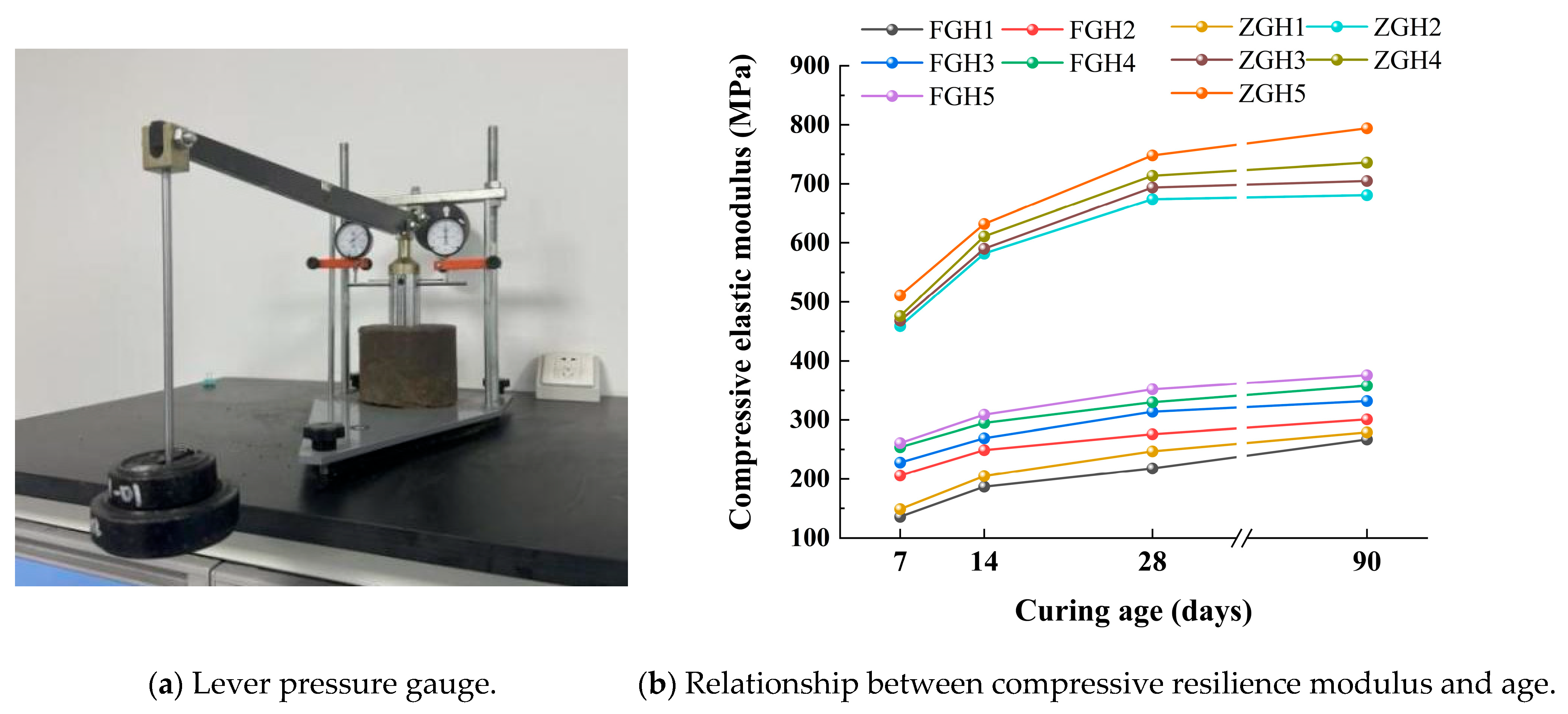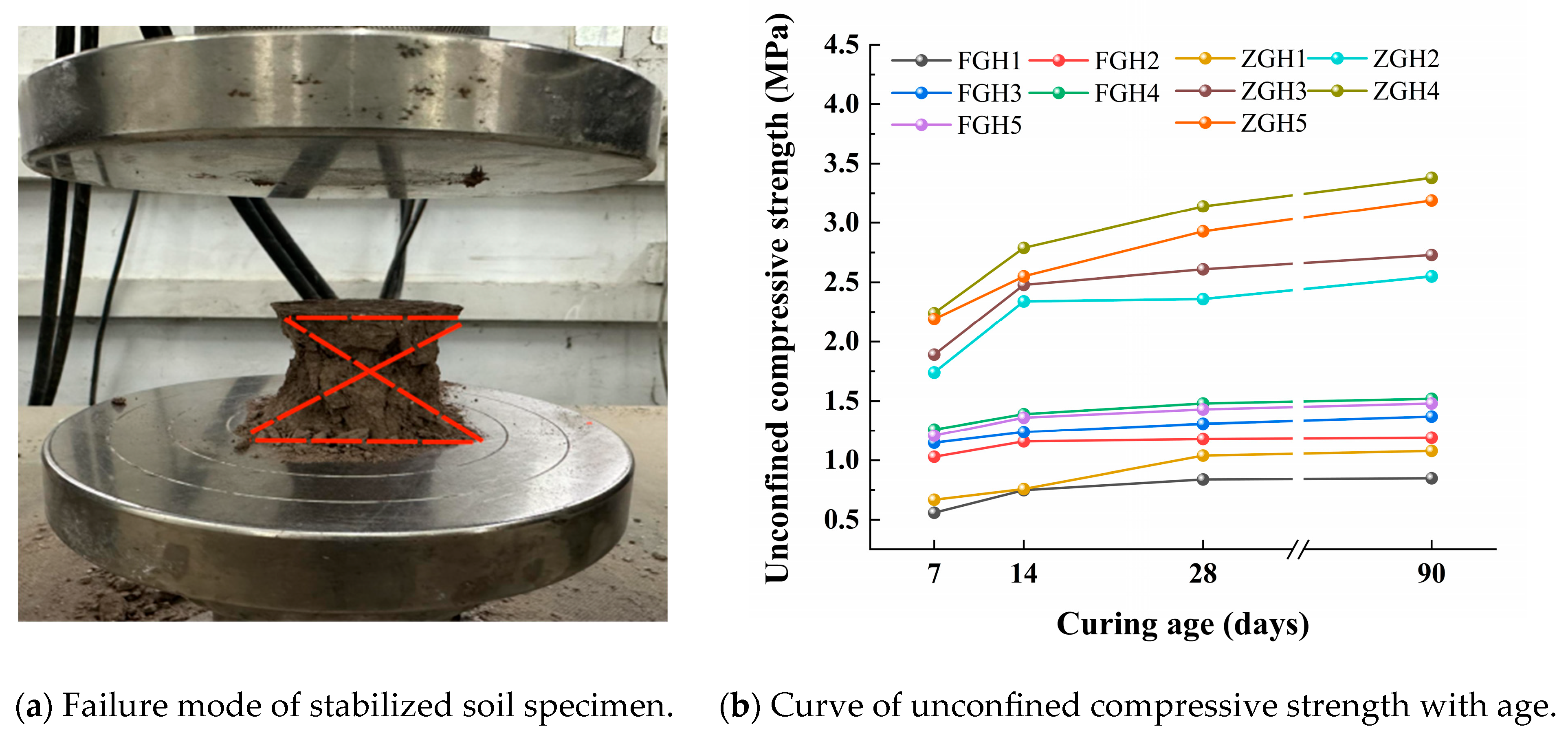 26], four standard curing ages of 7 days, 14 days, 28 days, and 90 days are set. On the last day of each curing age, the specimens are immersed in water for 24 h, and then the unconfined compressive strength test is carried out.