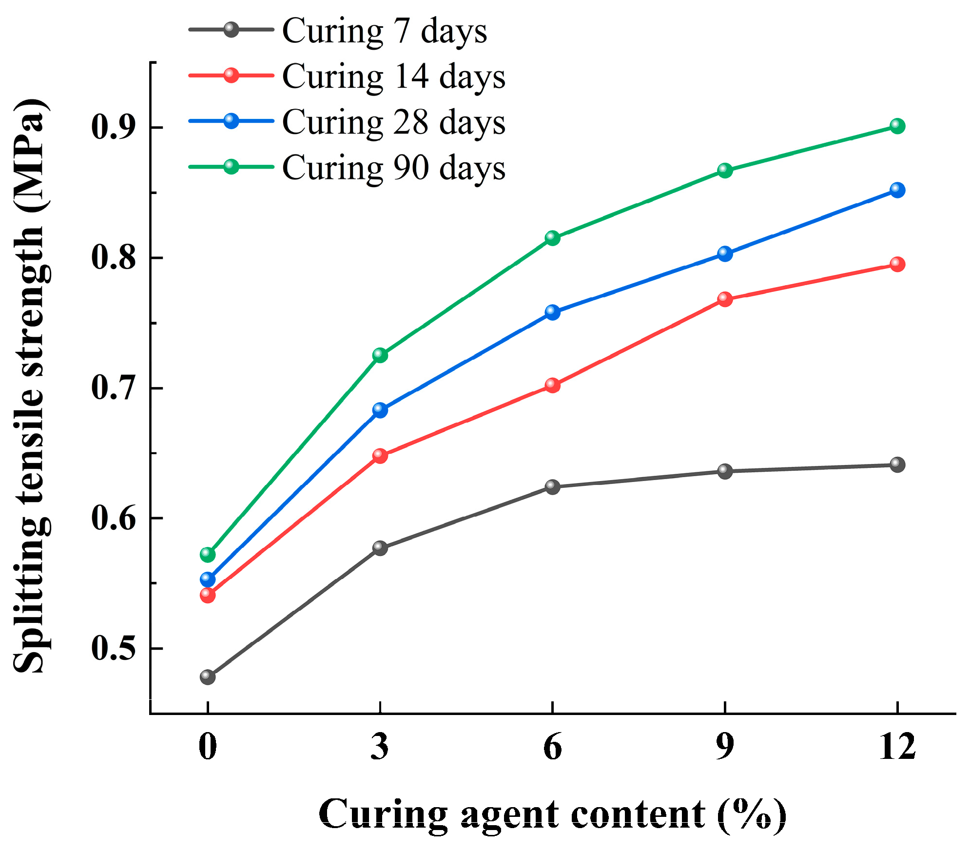 28]. However, excessive stabilizers will generate a considerable amount of heat, causing local expansion or cracking of the soil and reducing the toughness of the soil particles. Therefore, the selection of an appropriate amount of stabilizer plays a significant role in enhancing the splitting strength of water-based drill cuttings stabilized soil, and it plays a dominant role in the later strength improvement.