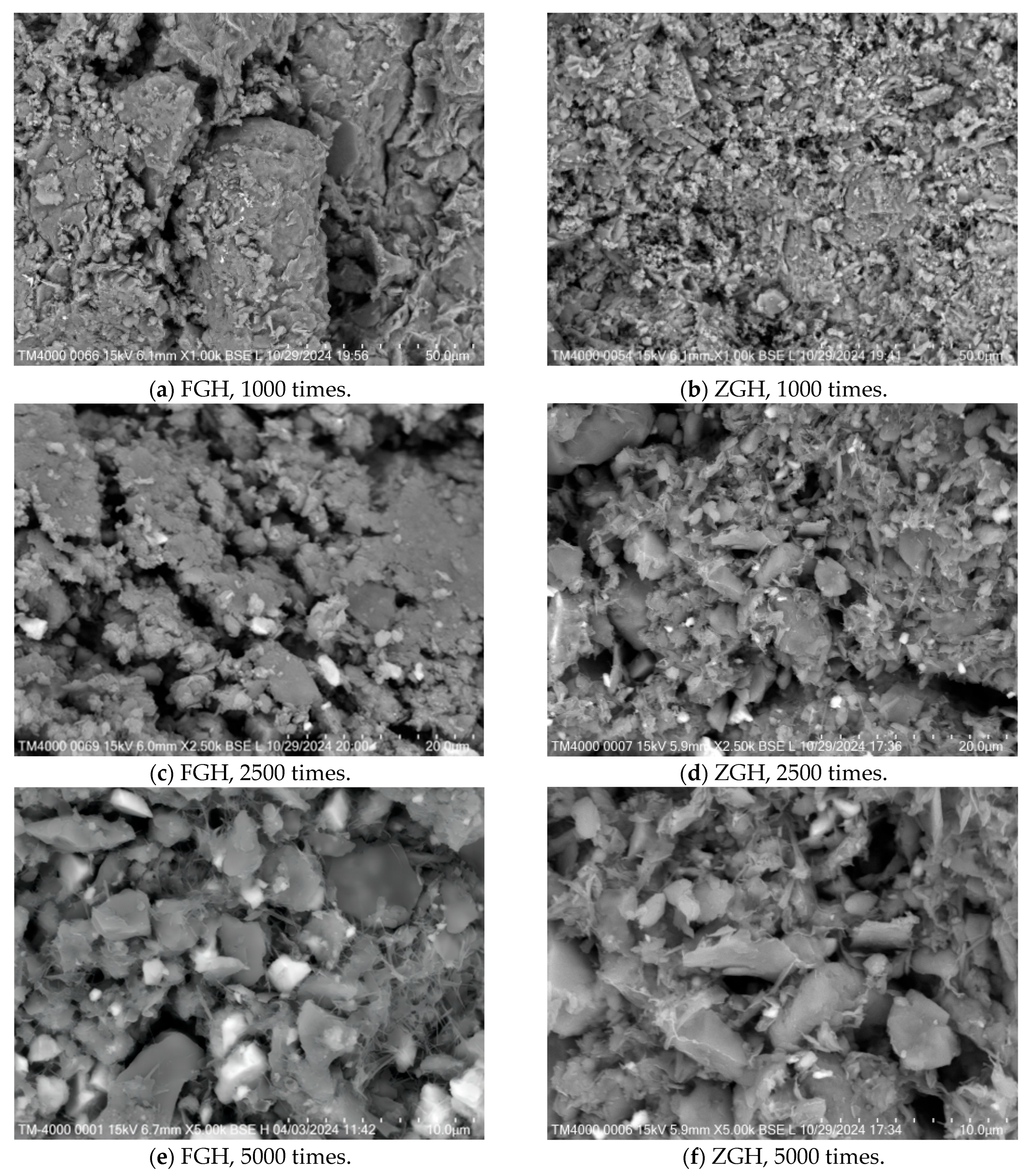 Based on the above data analysis, it can be known that after the water-based drill cuttings filler is added with a stabilizer, a series of physical and chemical reactions will occur inside the stabilized soil during the mixing and compaction process, promoting the formation of cementing substances between the mixtures. These cementing substances enhance the agglomeration of stabilized soil, making the soil structure more compact. Meanwhile, the ettringite crystals produced by the cement in the CLP stabilizer exert a mechanical interlocking effect [
