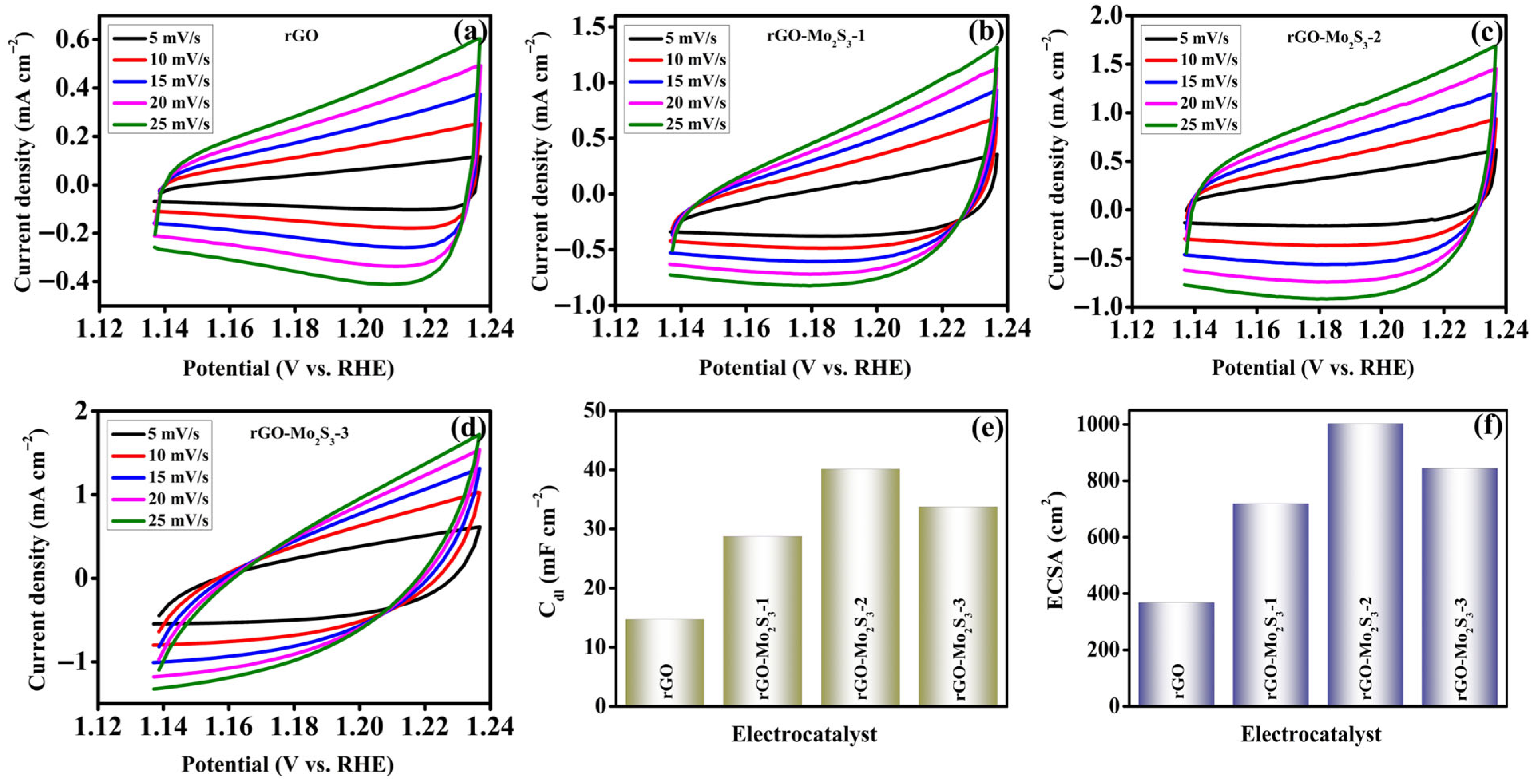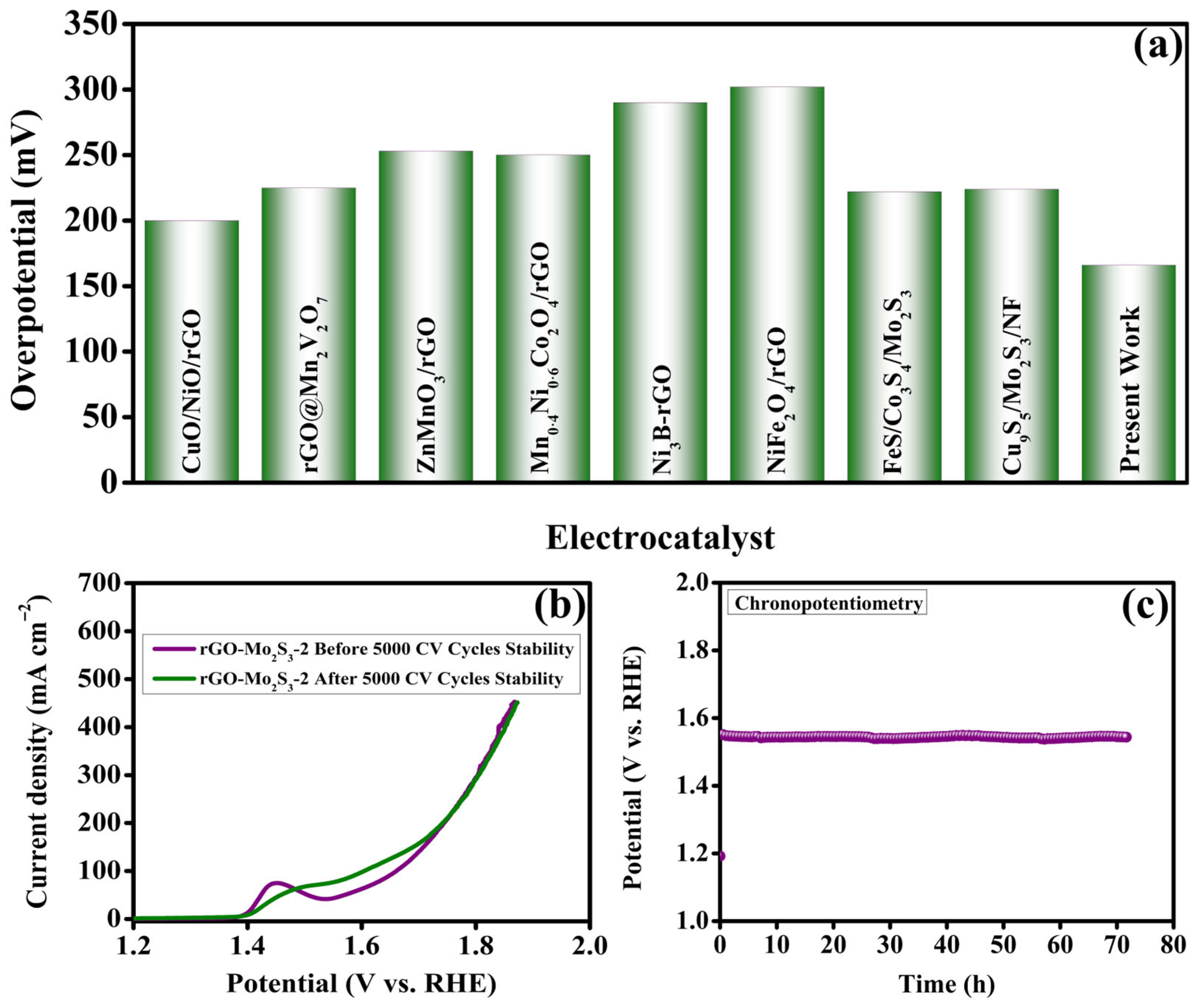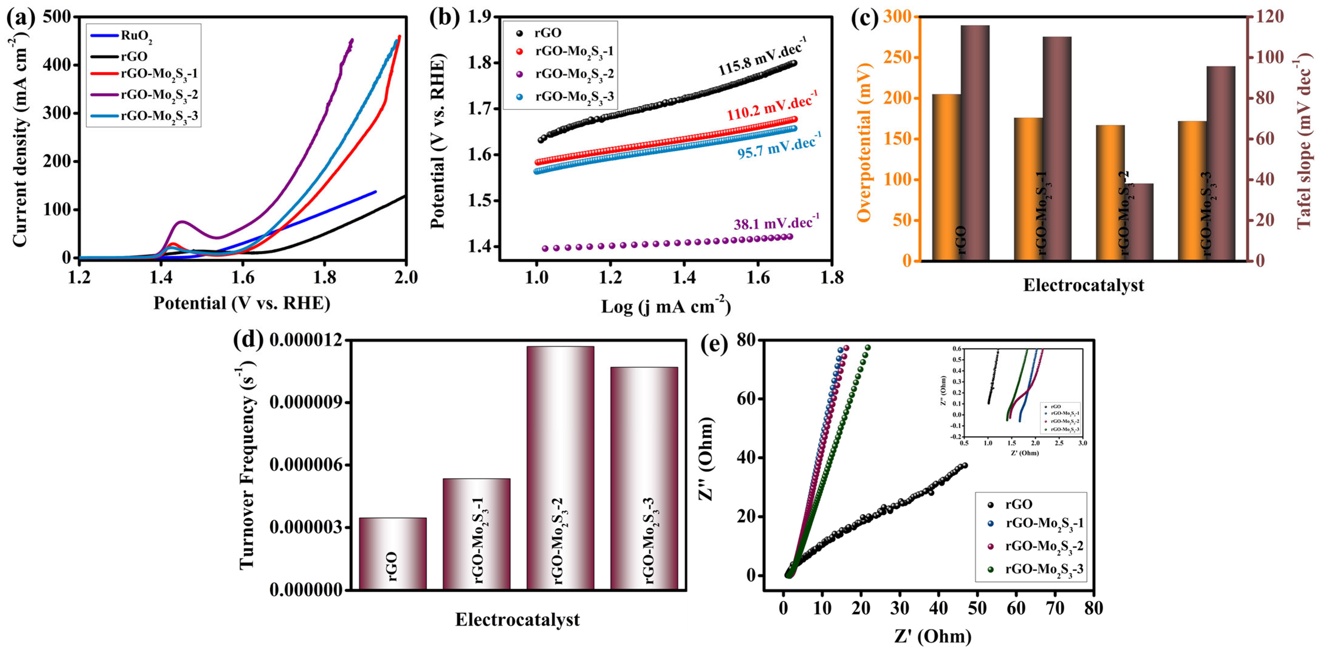 - rGO-Mo2S3-2 exhibits low OER overpotential of 166 mV at 10 mA cm−2 in alkaline media.