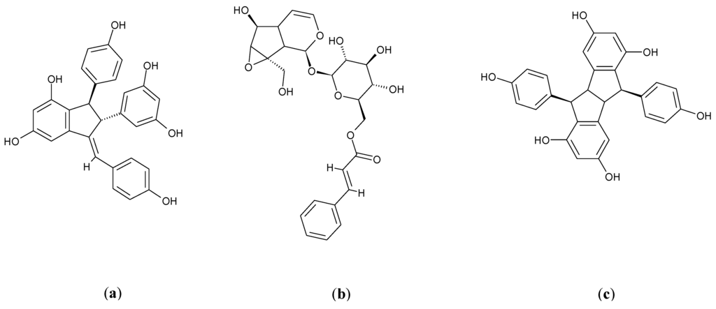 Bioactive phytochemicals of Cissus quadrangularis L.: (a) quadrangularin A (a stilbene dimer arising from resveratrol); (b) picroside I (an iridoid glycoside); (c) pallidol (a dimer of the stilbene resveratrol).