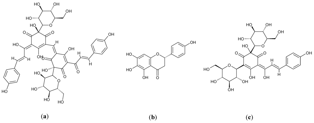 Bioactive phytochemicals of Carthamus tinctorius L.: (a) carthamin (a glucosylquinochalcone); (b) carthamidin (a flavonoid arising from chalcone); (c) safflomin A (a glucosylquinochalcone).
