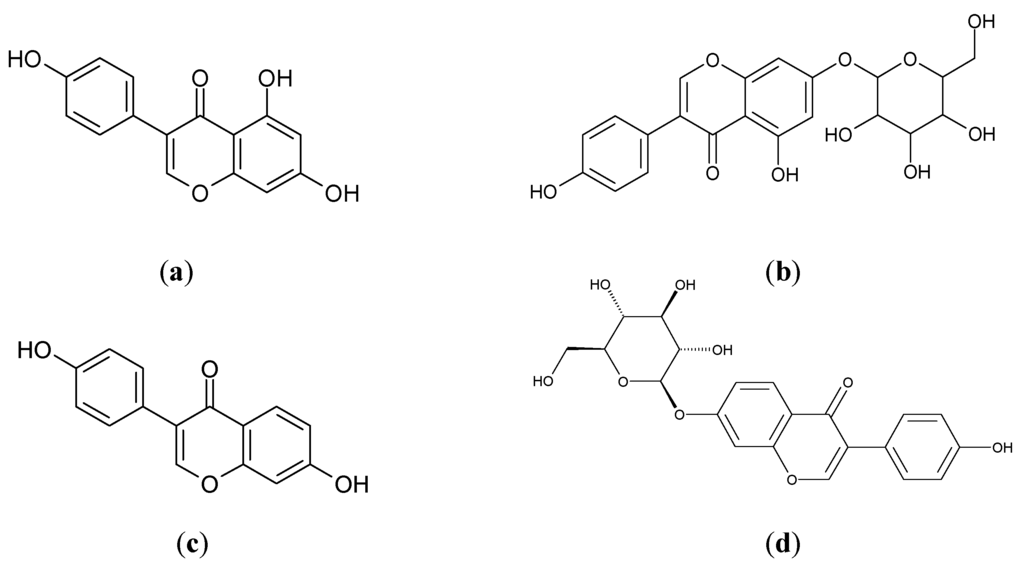 Bioactive phytochemicals of glucine max L. include the isoflavones genistein (a), daidzein (b) and their glycosides genistin (c) and daidzin (d), respectively.