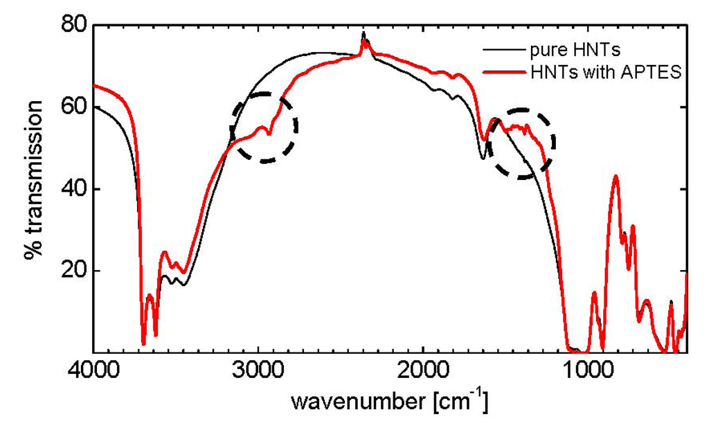 Silanization of the HNT surface was checked by FTIR Spectroscopy (Spectrum BX FT‑IR, PerkinElmer Inc.). Specimens were prepared by pelleting 1 mg of the HNTs with 100 mg of KBr. Spectra of the pure and the silanized HNTs are shown in Figure 1. Table 2 shows the band assignment. Dashed circles in the figure indicate lines originating from APTES. The bands at 2930 cm−1 and 1400 cm−1 belong to the symmetric stretching mode and the deformation mode of the CH2 groups [].