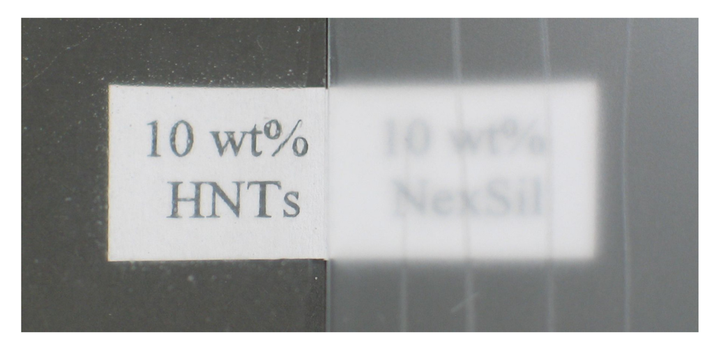 With HNTs (silanized or not) added at a fraction less than or equal to 10 wt%, the appearance of the films to the naked eye was unchanged. Figure 2 compares an HNT-filled film (unsilanized tubes) to a film filled with NexSil silica spheres. Clearly, the HNT-filled film allows one to read the text underneath. The degradation in transparency is mostly due to an orange skin, which has developed at the film surface. When making the comparison, one has to be aware of the fact that the particle diameter was 85 nm for the silica spheres. Silica spheres of that size are known to scatter light rather efficiently. The purpose of the figure is to show that the films filled with HNTs are still transparent, even though the length of the rods exceeds the wavelength of light, λ. As is well-known, equally transparent coatings can be produced with silica nanospheres, provided that sufficiently small spheres are employed.