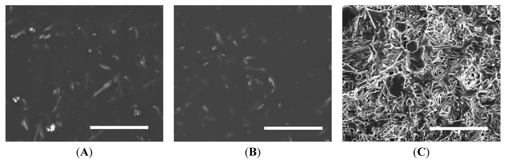 Scanning electron micrographs of films filled with unsilanized HNTs (10 wt%). (A) Cast; (B) Cast with subsequent ultrasound treatment; (C) Sample containing 80 wt% HNTs in an acrylic matrix. Panels A and B suggest that the HNTs are immersed into the bulk of the film. Panel C shows a counter example, where the tubes stick out of the surface. All scale bars correspond to 5 µm. Panel C is reprinted with permission from reference [] (Copyright 2012, American Chemical Society).
