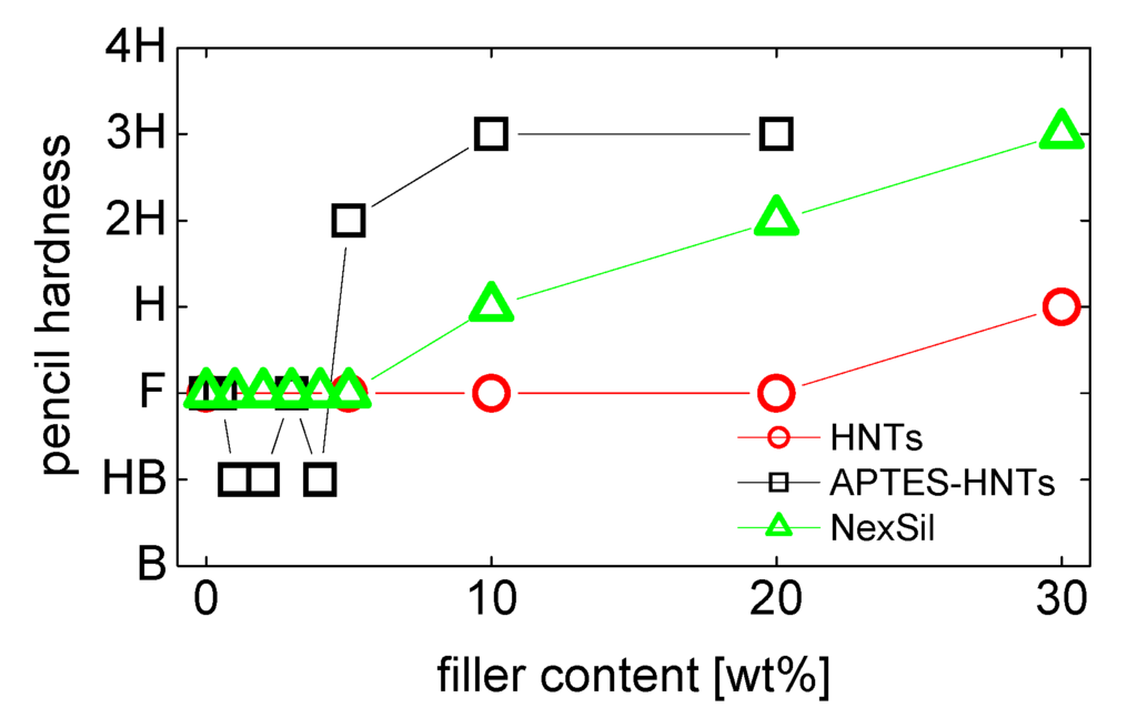 As the results show, there is a clear improvement in pencil hardness even at HNT weight fractions below 10%. We compare these results to the hardening obtained with silica spheres. The spheres also improved the hardness, but the dependence on the added amount was more gradual.