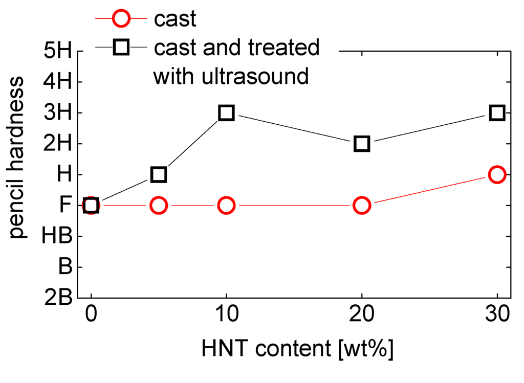 Figure 5 separately addresses the issue of sonication. It compares the pencil hardness achieved with non-silanized HNTs with and without sonication. The open circles are the same data as in Figure 4. The squares are pencil hardness obtained with the same material, but it was floated on an ultrasonic bath while drying. As the figure shows, an improvement is found for these process conditions. The improvement achieved with functionalization and the improvement achieved with sonication both amount to about two units. There were no synergetic effects: silanized nanotubes treated with ultrasound achieved about the same pencil hardness as the silanized HNTs with no ultrasound treatment. We have at this point not systematically investigated the dependence of pencil hardness on duration of the ultrasound treatment. Figure 5 demonstrates that an ultrasound treatment has potential for improvement. The details need further studies.