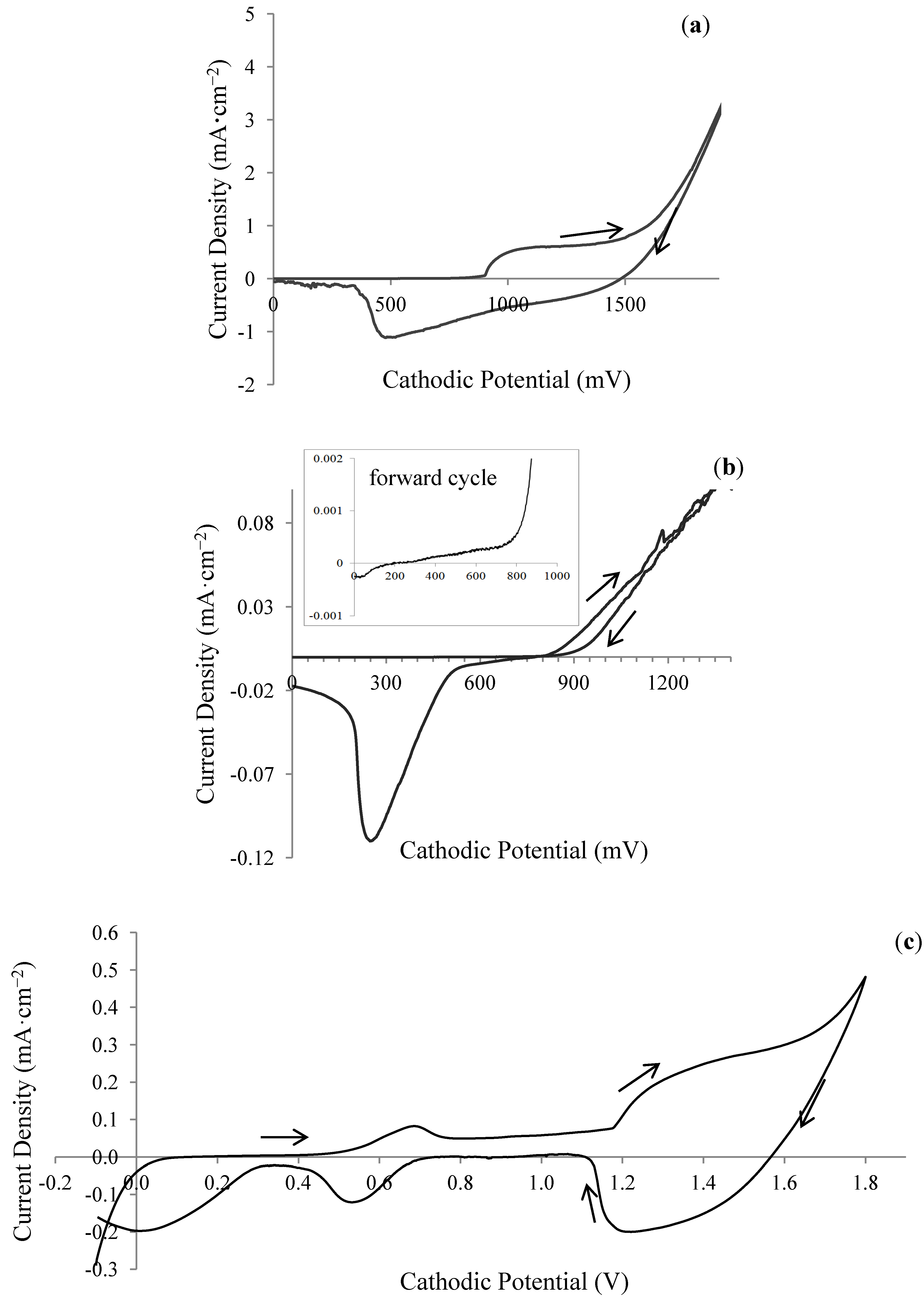 The electric current passing through the aqueous electrolyte as a function of the voltage applied between the anode and the cathode (voltammogram) provides guidance for selecting the material deposition voltage. Figure 1 shows typical voltammograms for (a) 1 M CdSO4 solution; (b) TeO2 solution; and (c) the combined electrolyte with a mixture of 1 M CdSO4 and TeO2 solutions. The pH of each solution was adjusted to 2.00 ± 0.02 before taking the voltammograms. Figure 1a shows the deposition of Cd at Vg ~900 mV and Figure 1b shows the deposition of Te at Vg ~200 mV, following the E0 values of Cd (E0 = −0.403 V) and Te (E0 = +0.593 V) [8]. When the two solutions are mixed (Figure 1c), the voltammogram indicates the growth of Te-rich CdTe starting from ~1200 mV, and the formation of CdTe layers with varying stoichiometry. With the help of these voltammograms and XRD of layers grown at different fixed voltages, it is possible to identify a range of voltages (1.500–1.600 V) suitable for CdTe growth. By growing materials systematically at constant voltages in this range and characterising the layers, an optimum growth voltage can be established. The formation of stoichiometric CdTe depends on parameters like concentration of electrolyte constituents, pH value, temperature, stirring and the applied voltage. Therefore, a set of growth parameters should be established in order to grow stoichiometric CdTe layers.