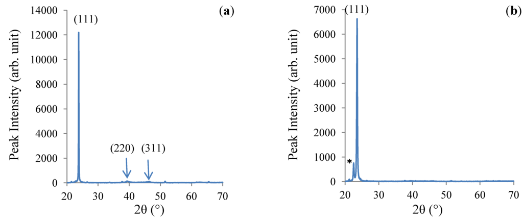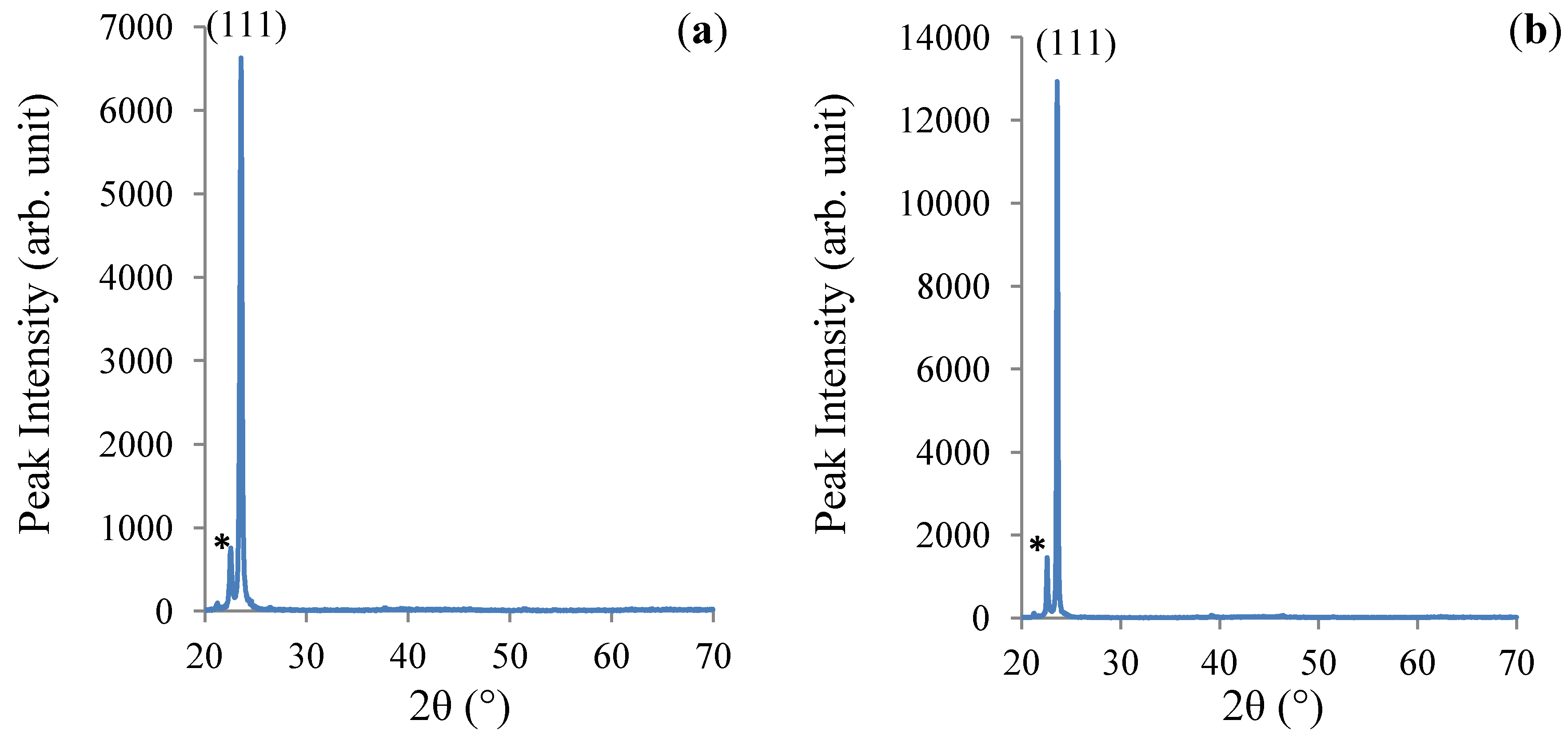 Upon heat treatment in air, or CdCl2 treatment followed by heat treatment in air, at temperatures up to ~385 °C, enhancement in the crystallinity of the layer is observed. This is experimentally shown by the increase in intensity of the (111) peak and the decrease in full width at half maximum (FWHM) (see Figure 4). A low intensity peak at 2θ = 22.6° (marked * in Figure 2b and Figure 4) corresponds to TeO5 or Cd3TeO6, but it is more representative of Cd3TeO6. Electroplated CdTe layers from aqueous solutions are exposed to atmosphere and hence oxygen can form bonds with surface Cd and Te showing Cd3TeO6 properties. The absence of this peak in Figure 2a may be due to the presence of relatively lower Te content in the electrolyte during deposition since TeO2 solution is manually added to deposition electrolyte from time to time.