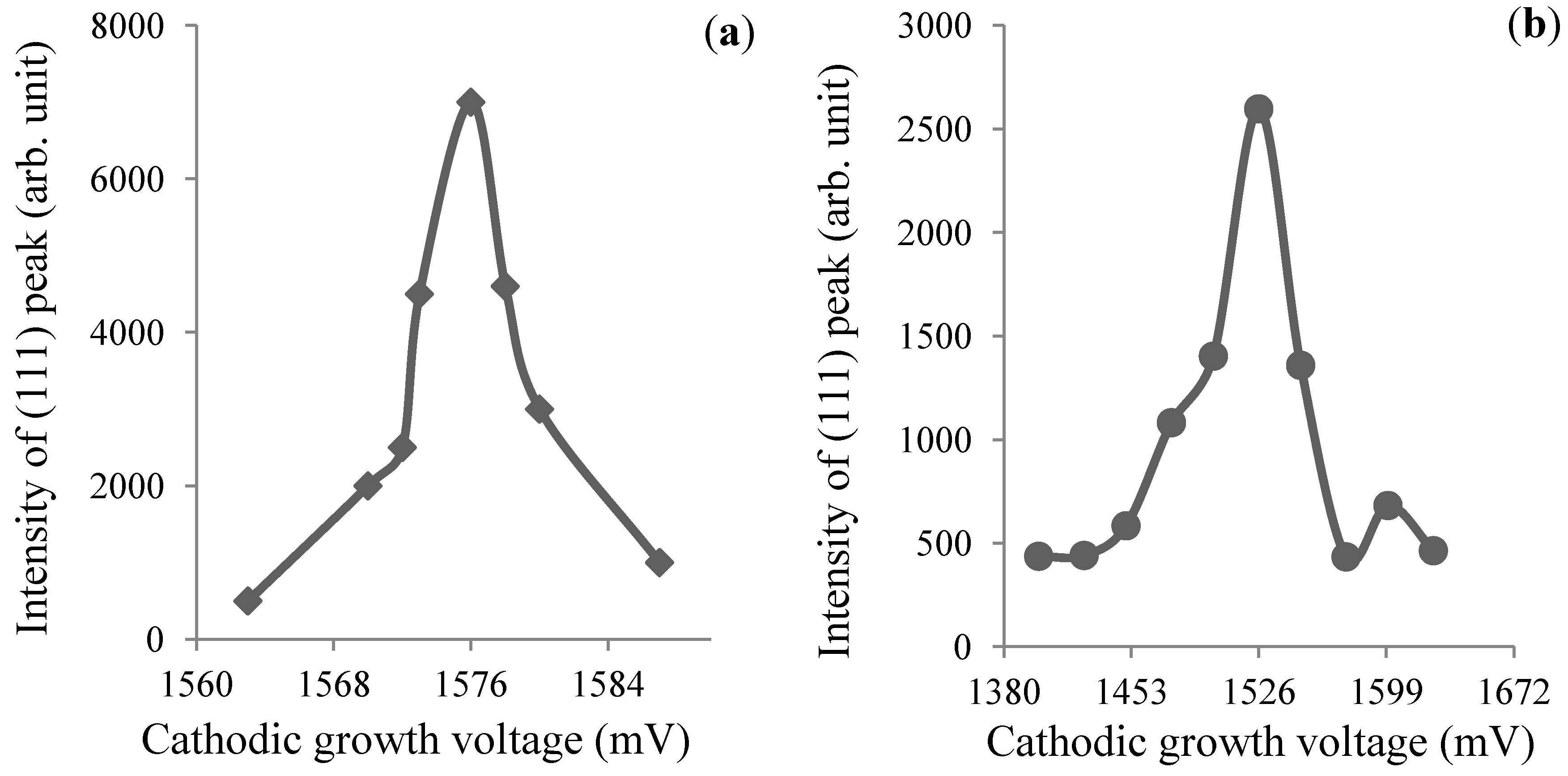 Intensity of (111) peak as a function of growth voltage for (a) pH = 2.00 and (b) pH = 1.44. The growth of stoichiometric CdTe is shown at 1.576 V and 1.526 V at the two different pH values for the samples showing highest crystallinity.