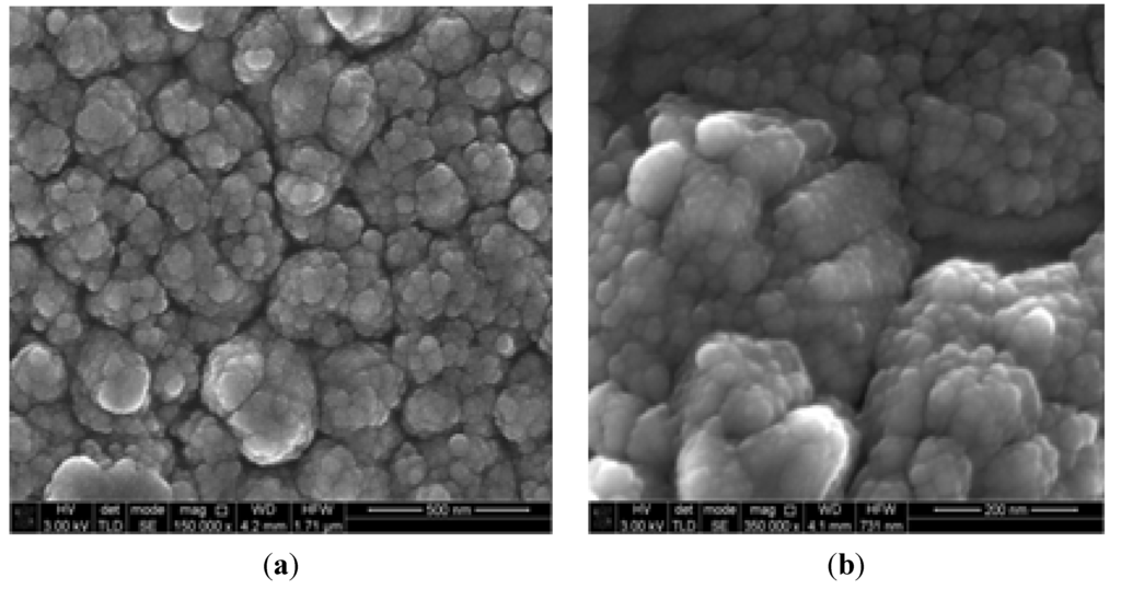 Deep knowledge in surface morphology is extremely important in the development of thin film solar cells. At a magnification of ×10,000 the CdTe layer appears to consist of cauliflower-like clusters. When magnified to ×150,000 and ×350,000, the structure of these clusters is shown in Figure 6a,b. On the surface, micron-sized large agglomerations are observed consisting of many smaller grains of the size of a few tens of nanometers. After heat treatment with CdCl2, these smaller grains become larger grains of the size in the (1–2) µm range (see Figure 8c).