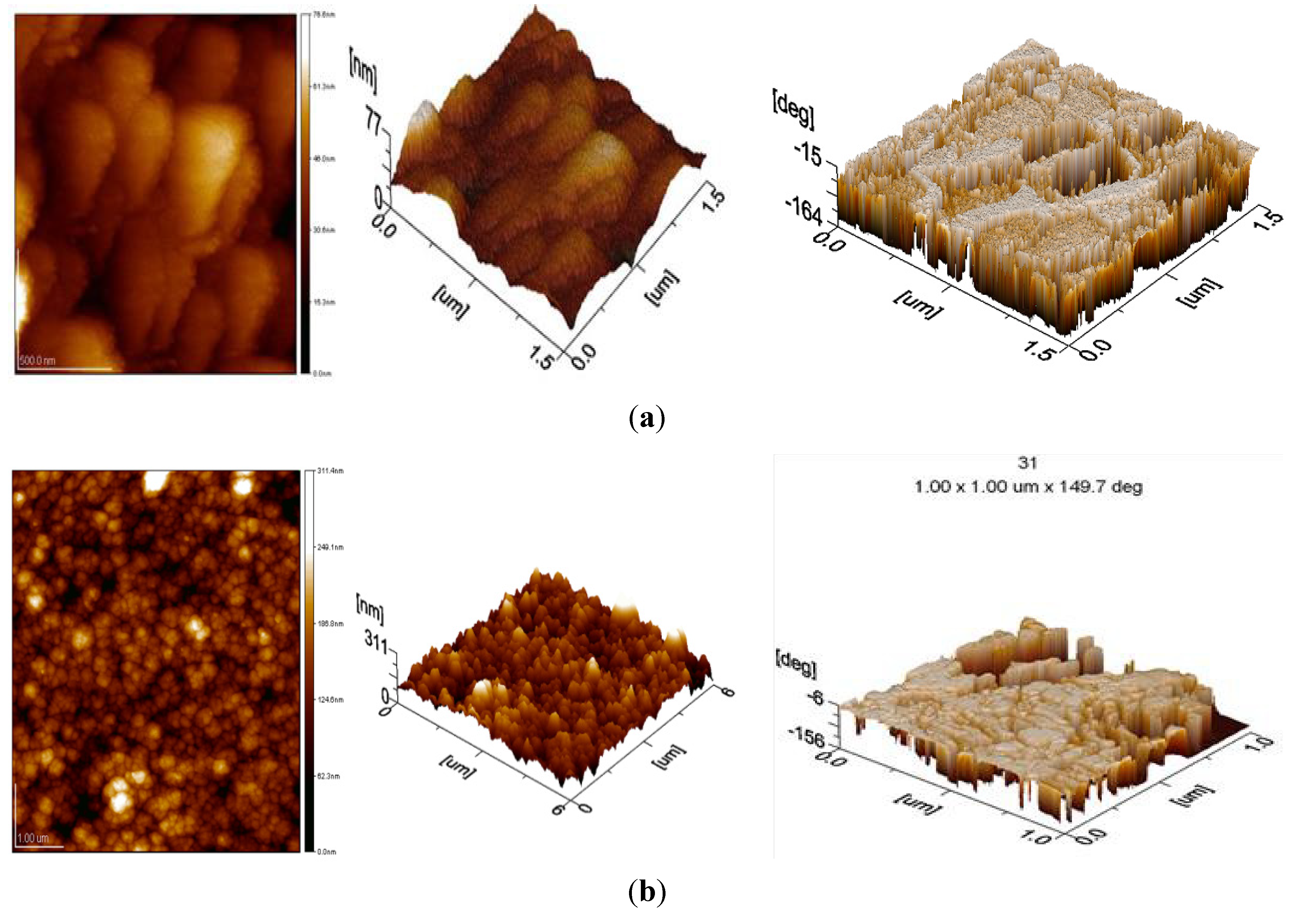 AFM images provide another complimentary method to examine surfaces of thin layers with high magnification. 2D-AFM images provide information on surface morphology and 3D-AFM images can be more useful to observe fine details of material grains in nano- and micro- scales. Figure 7a presents typical 2D and 3D-AFM images showing the morphology details of electro-plated CdS layers. Figure 7b shows similar images obtained for ED-CdTe layers. It is evident that both CdS and CdTe grow as nano- and micro-size grains normal to the FTO surface. This is expected due to spiky nature of FTO surface and application of a DC voltage to this surface during electroplating. Presence of high electric fields at spikes during electroplating creates nucleation at these points. Since any material prefers to grow on its own surface, CdS and CdTe grains grow normal to the FTO surface while slowly increasing in diameter laterally. Low temperature growth techniques such as electroplating do not provide adequate energy for depositing atoms for lateral diffusion. As a result, well defined nano- and micro-grains or pillars are formed during electroplating.