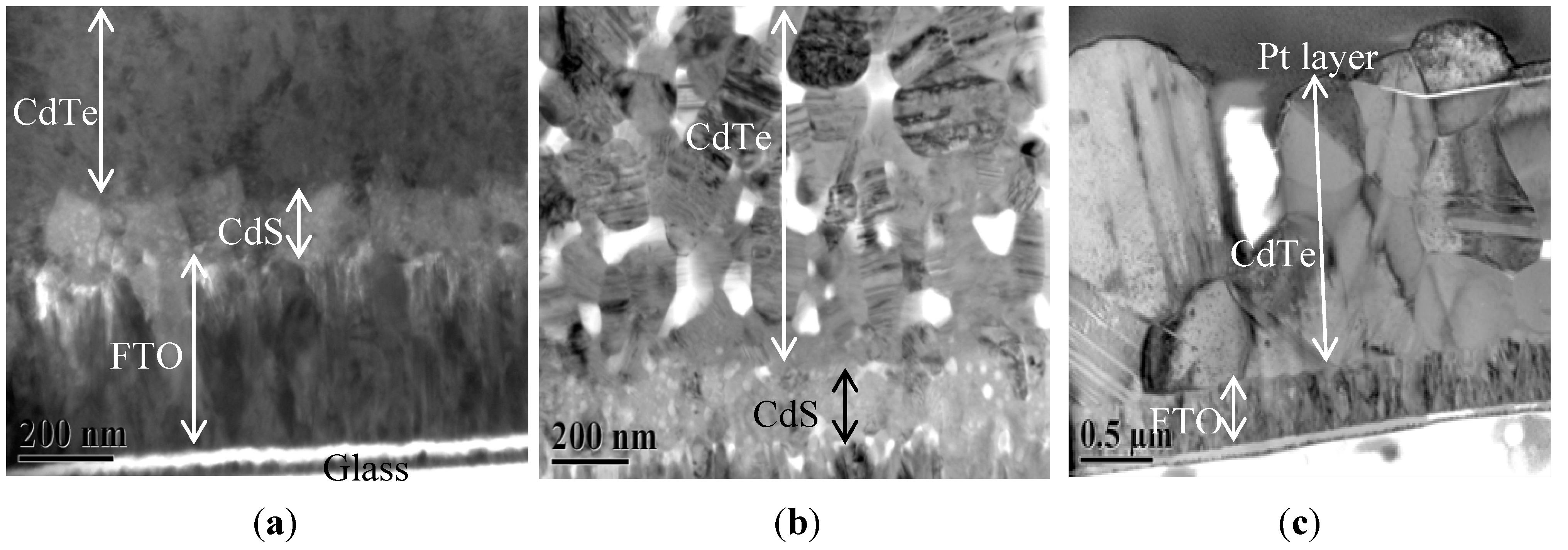 Transmission Electron Microscopy (TEM) images of (a) as-deposited glass/FTO/CdS/CdTe; (b) heat-treated structure with 0.01% CdCl2; and (c) heat-treated structure with 1.0% CdCl2 for comparison. Note the formation of large grains comparable to CdTe layer thickness and complete absorption of the CdS layer into CdTe layer under this condition.
