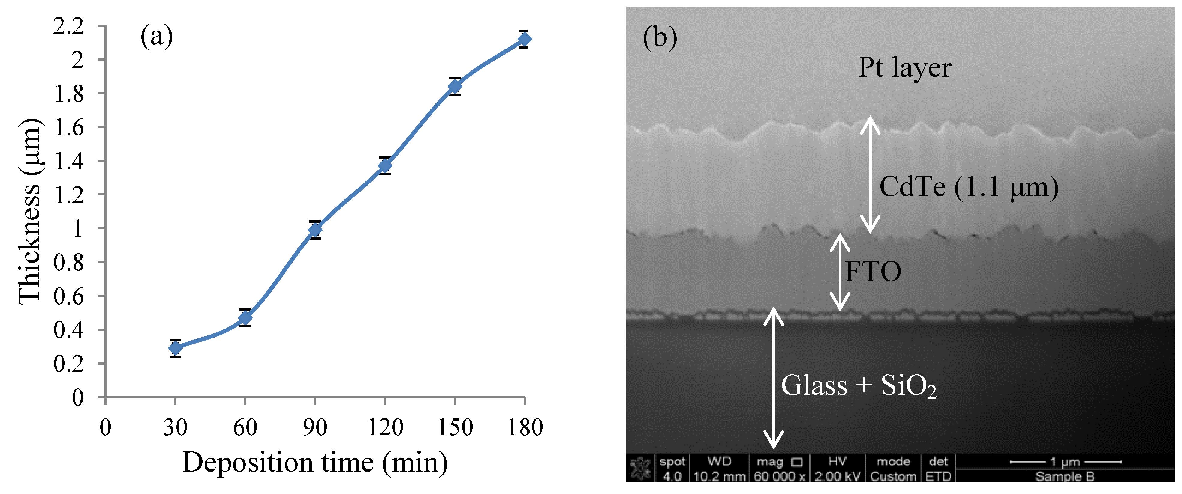 (a) Theoretical estimation of CdTe layer thickness and (b) a cross section of ~1.1 μm-thick CdTe layer as estimated from SEM cross section (Growth time = 105 min).