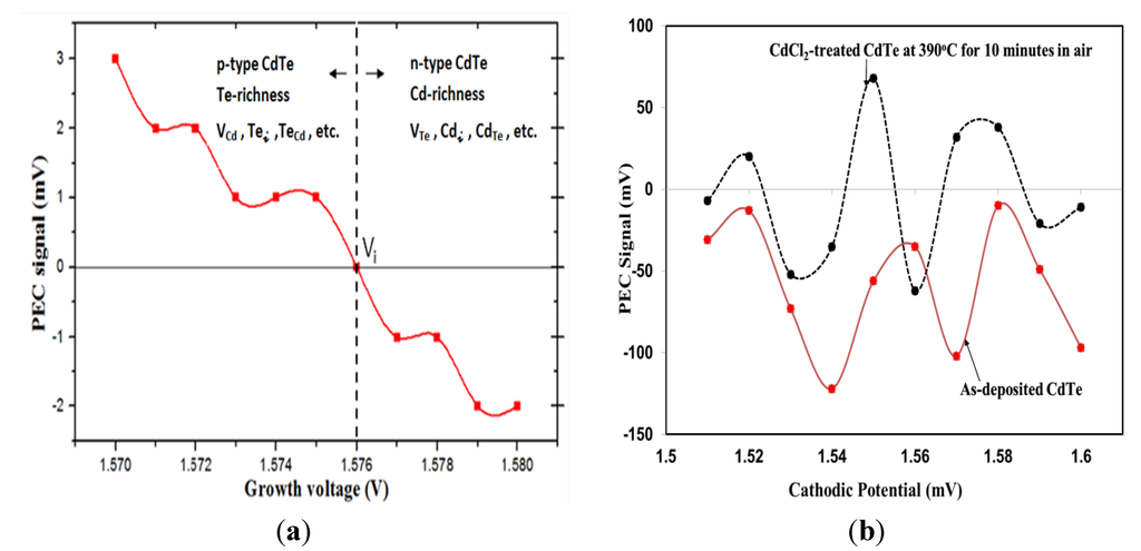 Typical PEC signals observed for a series of CdTe samples grown at different cathodic voltages are shown in Figure 10a,b. Each experimental point shown is the average of five measurements, and therefore error bars are purposely omitted to keep the clarity of the diagram. From the E0 values of Cd (E0 = −0.403 V) and Te (E0 = +0.593 V), the easier material to electrodeposit is Te since it has a more positive E0 value. To attract more Cd, large cathodic voltages need to be applied. It is therefore clear that the CdTe layers grown at low voltages are rich in Te, and show p-type electrical conduction. The layers grown at high cathodic voltages are rich in Cd, and show n-type electrical conduction.