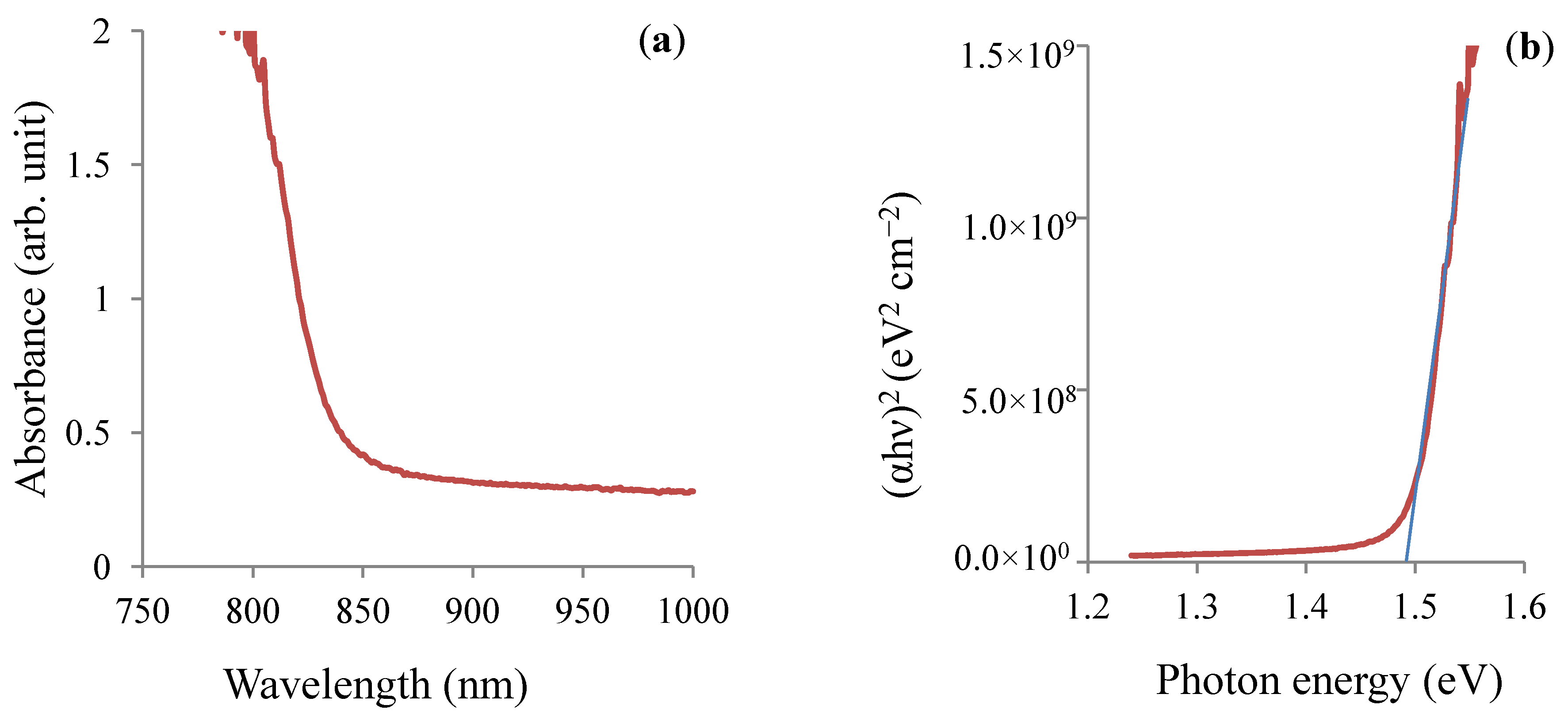 (a) Absorbance vs. wavelength and (b) the Tauc plot, for electroplated CdTe layer on glass/FTO substrate.