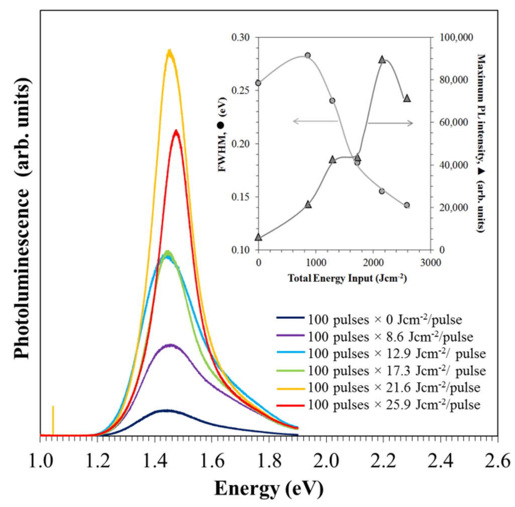 As the layers are treated with pulse energy densities ranging from 8.6 to 21.6 J·cm−2, the band to band emissions were also observed to increase. The width of the peak (i.e., FWHM) also decreases showing the best results at treatments with 21.6 J·cm−2 (Figure 12 inset). Photon emissions below the Eg are reduced due to the reduction of donor and acceptor like defects in the material. Photons emitted with energy greater than the Eg decrease due to coalescence of nano-sized particles into large grains, thereby reducing the quantum effects. Therefore the optimum IPL pulse for ED-CdTe appears to be close to 21.6 J·cm−2. Treatment with higher energy pulses (25.9 J·cm−2) displayed a reduction in band to band emissions, reducing the peak intensity and a slight shift to higher energies. This indicates deterioration of the film. This work was concentrated on the band to band optical transitions at room temperatures. In order to observe defect levels in the bandgap, low temperature PL work is needed and this is in progress.