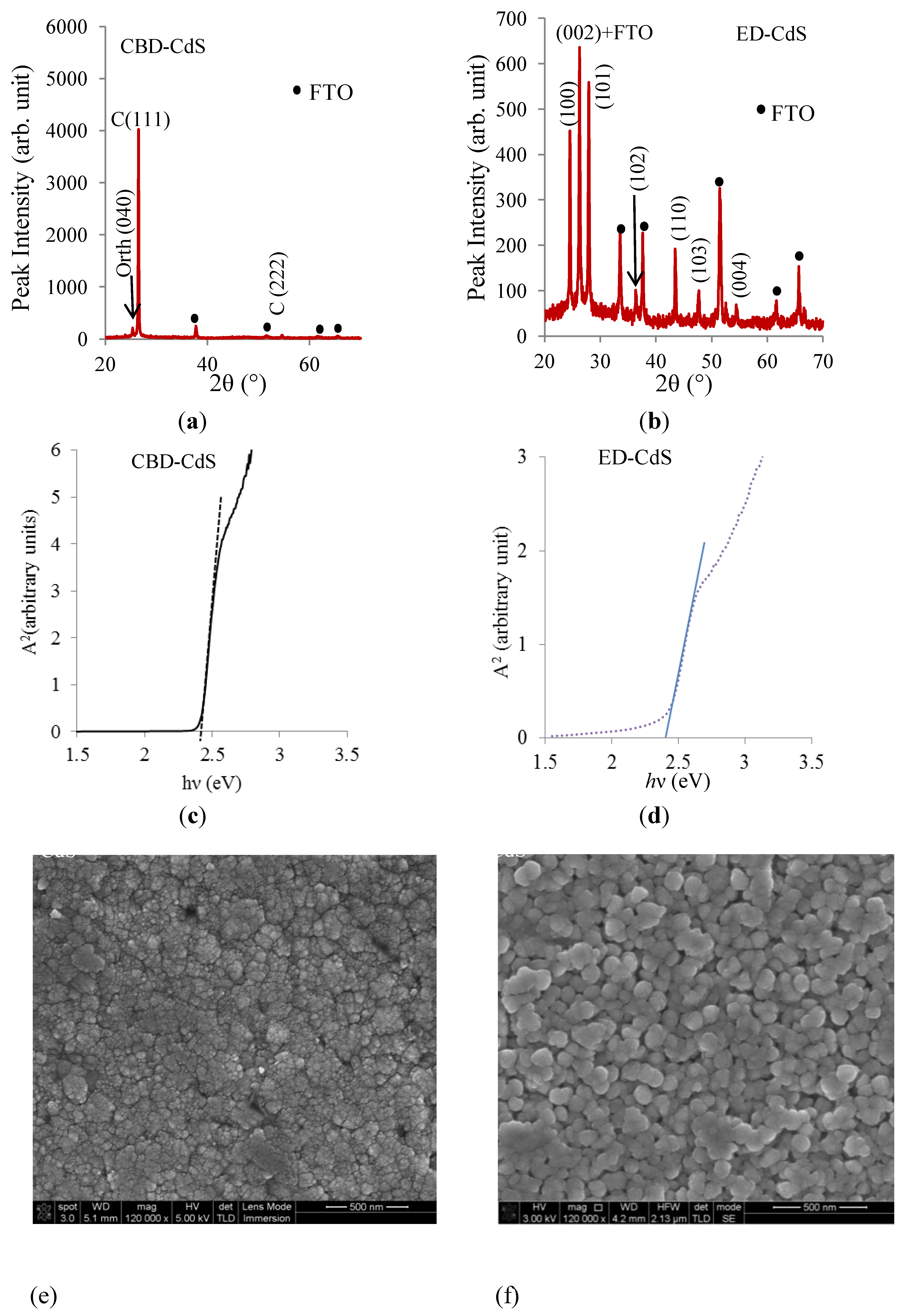 Many different methods have been used to grow CdS layers, such as chemical bath deposition (CBD), electrodeposition (ED), spray pyrolysis, sputtering and close spaced sublimation (CSS) [17,21,22,23,24]. These methods can be divided into two different categories; low-temperature and high-temperature growth methods. Techniques such as CBD and ED produce CdS layers at temperatures below 100 °C and as-deposited layers are not suitable for device fabrication. These layers must therefore undergo heat treatment at approximately 400 °C for 20 min in air to improve their structural, electrical and optical properties before depositing CdTe on the glass/FTO/CdS substrates. The authors’ research concentrates on CBD-CdS, ED-CdS and ED-CdTe layers. Therefore, most of the results shown here are examples of these three material layers. Heat treatment in air in general improves the crystallinity, and sharpens the optical absorption edge. Figure 14 shows typical XRD, optical absorption spectra and SEM images of heat treated CBD-CdS and ED-CdS for comparison. These films exhibit cubic and hexagonal polycrystalline materials respectively but both layers are n-type with energy bandgap of 2.42 eV.