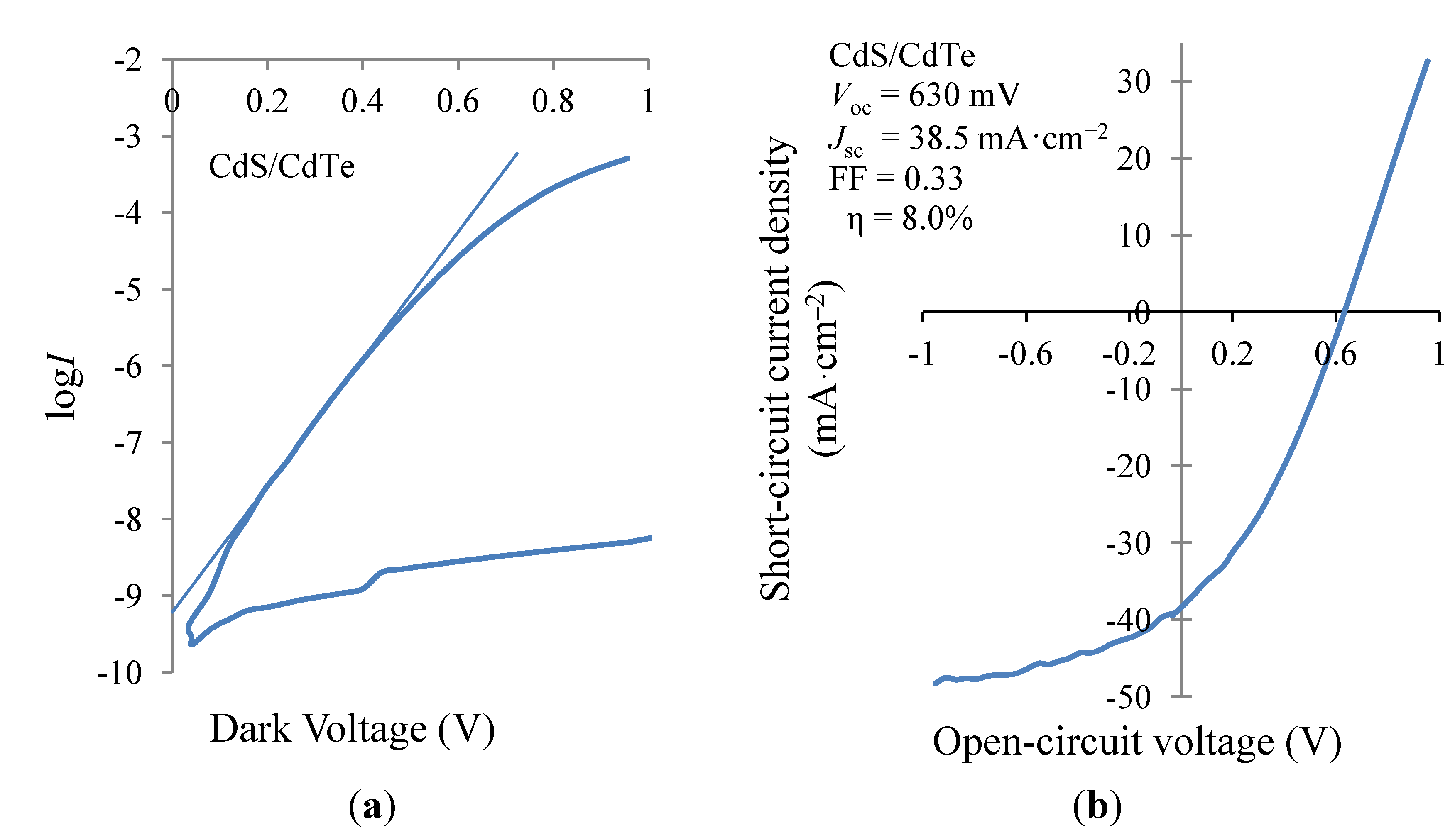 For device fabrication, it is essential to grow CdTe on glass/FTO/CdS substrates, in addition to improving electrodeposited layers by heat treatments and processes such as CdCl2 treatment. Successive deposition of CdS and CdTe layers, processing of these structures and deposition of the back metal contact completes the device fabrication. The area of the back metal contact was ~0.031 cm2 (2 mm diameter circular contacts), which accurately defines the solar cell active area, and when necessary, it is easy to isolate individual devices by removing material around the metal contact.