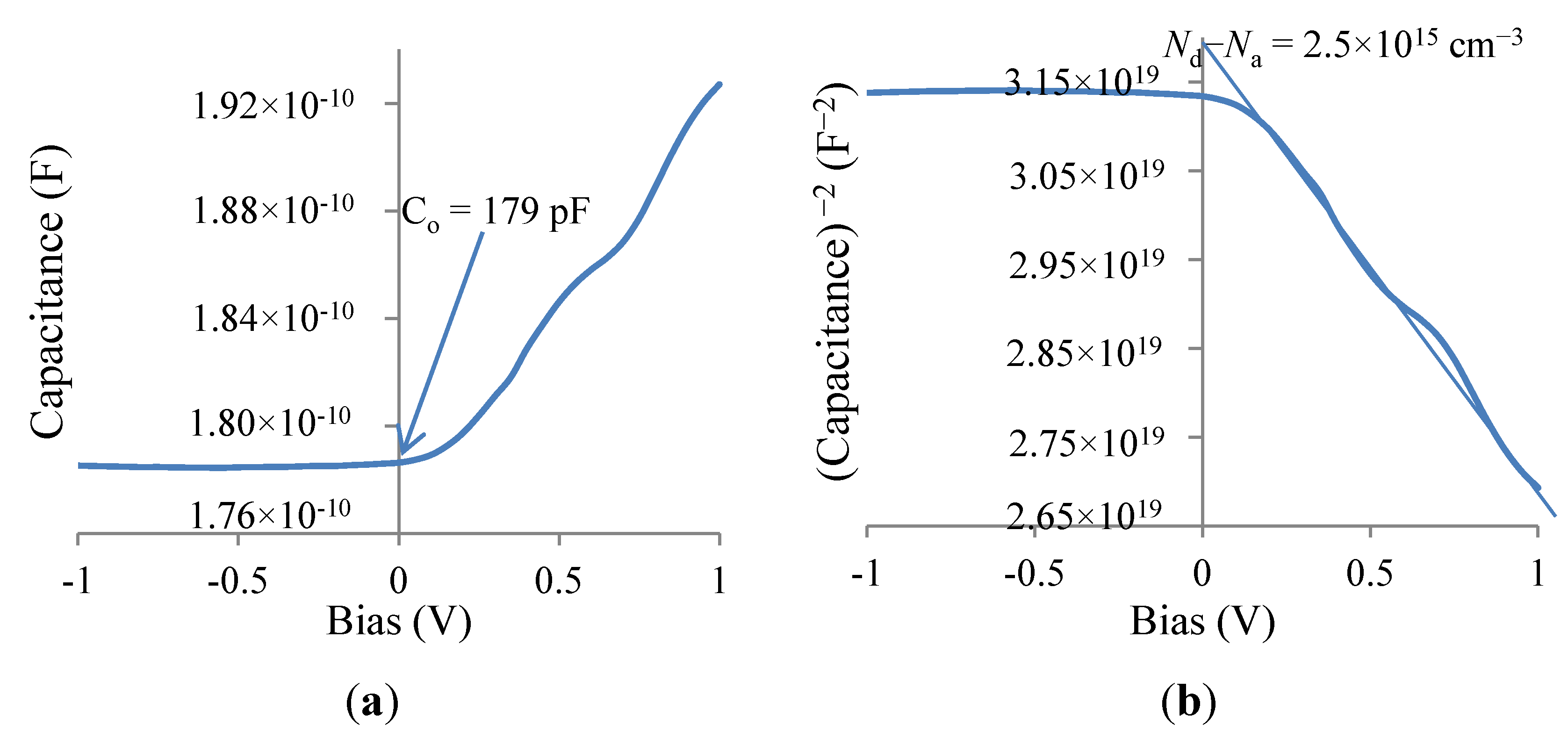 The rectification properties of completed devices were characterised using I-V measurements under dark conditions. Similar measurements under illuminated conditions were used to estimate solar cell parameters; open circuit voltage (Voc), short circuit current density (Jsc), fill factor (FF) and the conversion efficiency (η). Capacitance-Voltage (C-V) measurements were carried out to determine the doping concentration and approximate width of the depletion region.