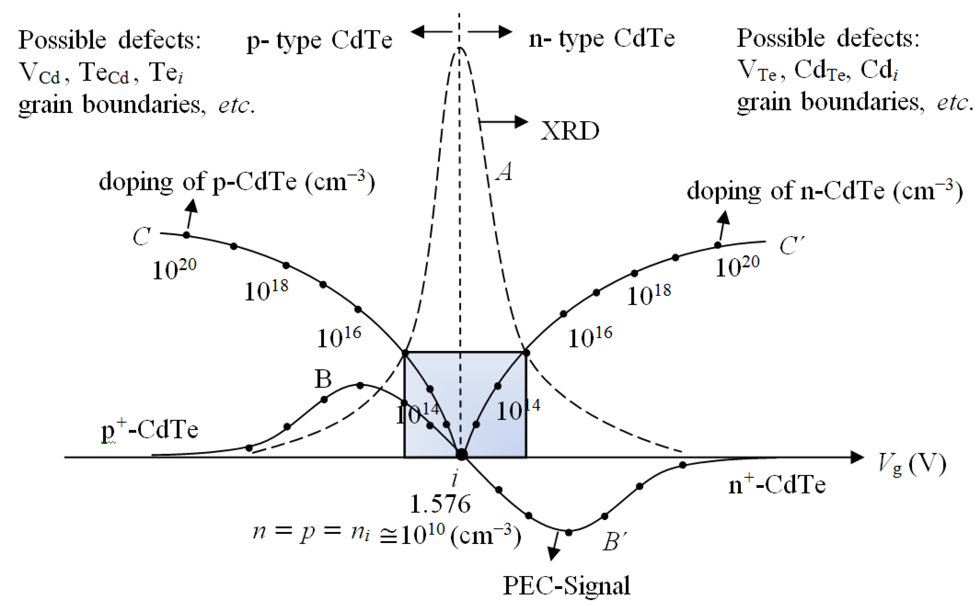 Although the PEC technique is simple, it provides crucial information for device development. For electrolytes with pH = 2.00 ± 0.02 and using the two-electrode system, the transition from n-type to p-type (i-point) takes place at Vg ~1.576 V. Indeed, when stoichiometric CdTe is formed with Cd:Te = 50:50, the material should show the highest crystallinity and the lowest electrical conduction, or intrinsic semiconducting properties. At this point the Fermi level should be in the mid-gap and the intrinsic carrier concentration is of the order of n = p ~ 1010 cm−3.