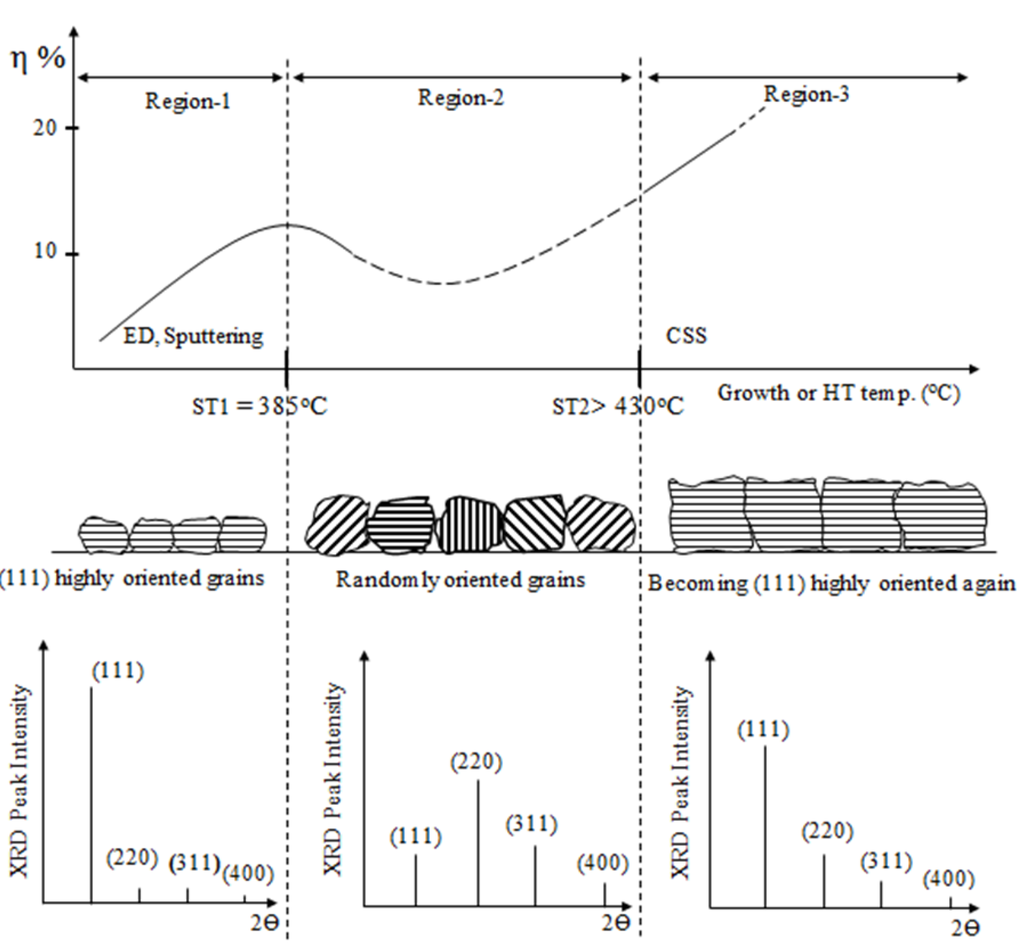 Schematic diagrams summarising CdTe grain growth patterns, corresponding XRD patterns and approximate solar cell efficiencies against growth or heat treatment temperature. Note three regions identified with a sudden phase transition at ST1 = 385 °C, and a slow phase transition taking place after ST2 > 430 °C.