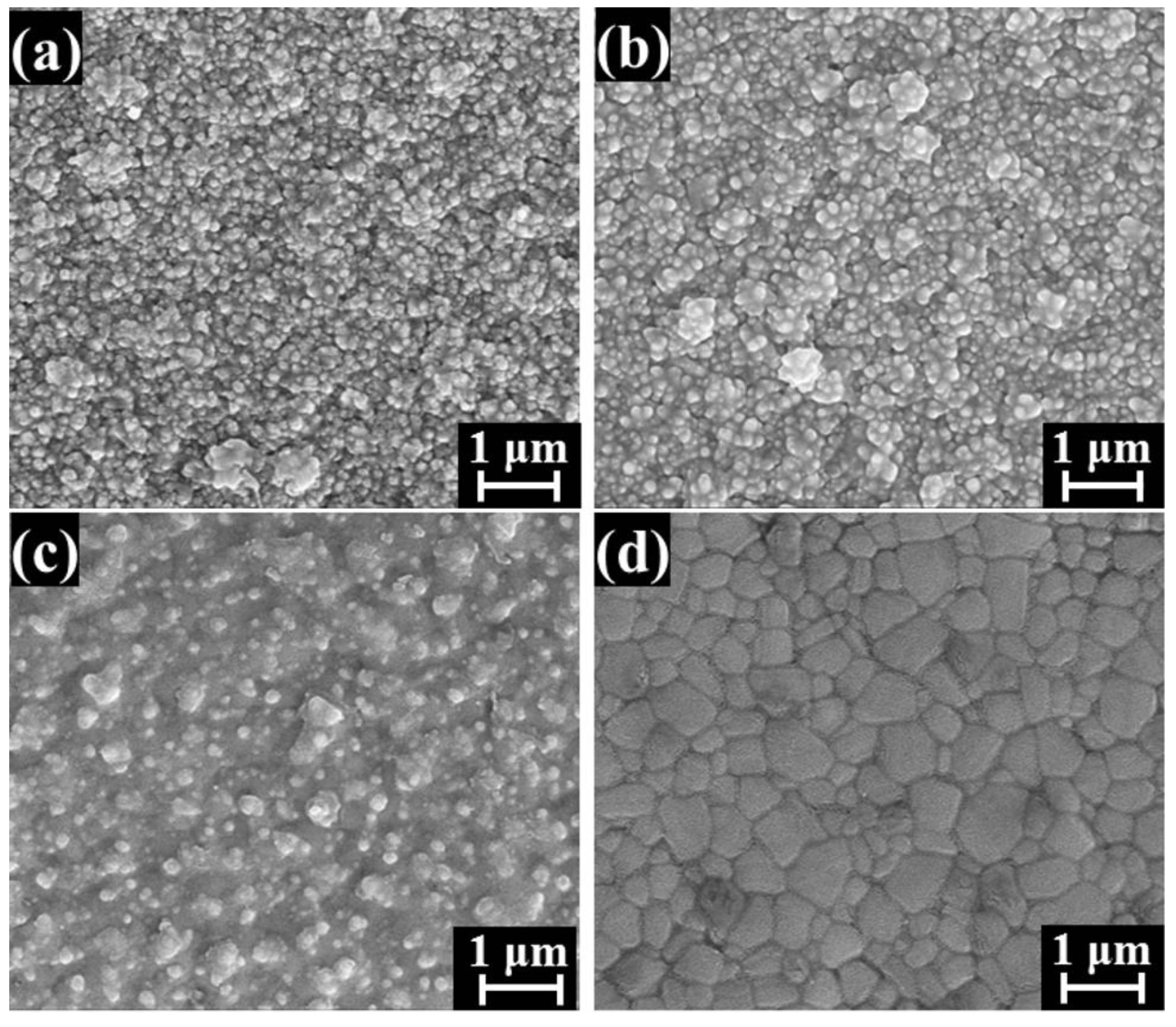 SEM topographical images of IPL treated CdTe. The films were treated using 100 pulses of light with an energy density of (a) 0 (i.e., as deposited), (b) 12.9, (c) 21.6, and (d) 25.9 J·cm−2. Note the gradual growth of grains, melting of the material and then sudden transformation of the layer into much larger grains creating gaps in between and increasing surface roughness.
