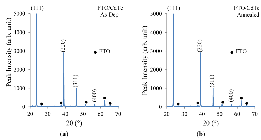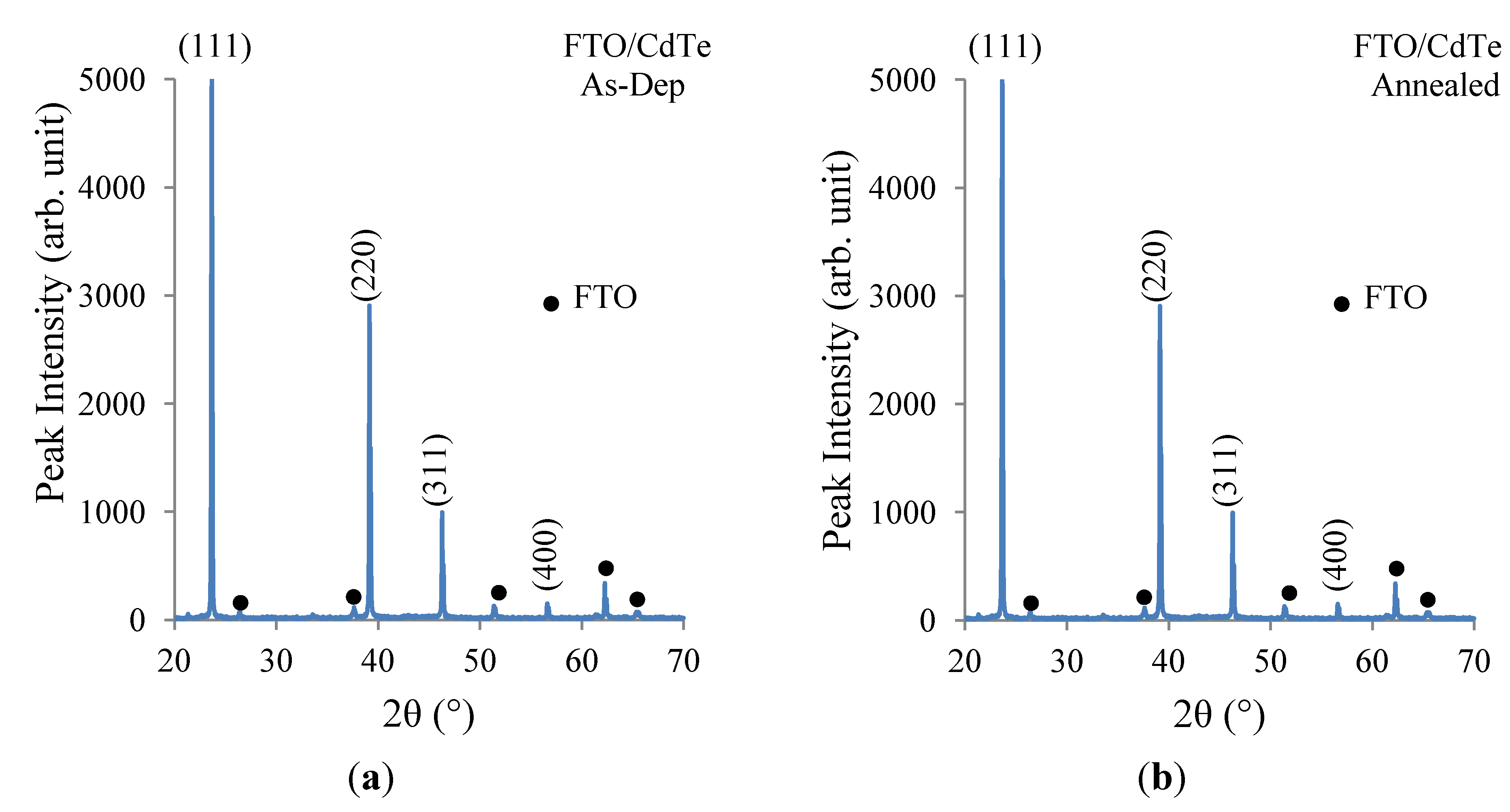 X-ray diffraction is widely used to identify material phases, crystallinity and the size of crystallites within the layers. A typical X-ray diffraction pattern for an as-deposited CdTe layer grown on glass/FTO substrate is shown in Figure 2a. The diffraction pattern is dominated by the (111) peak indicating the highly preferential growth along this particular crystallographic direction. The other two CdTe peaks, (220) and (311), are extremely weak due to the preferential growth along the (111) plane. Figure 2b shows the XRD pattern of as-deposited CdTe layer on glass/FTO/CdS substrate.