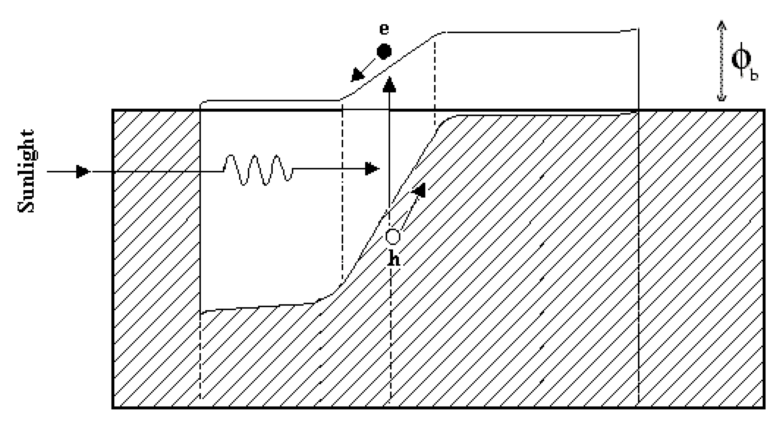 One disadvantage created by the rod-type material is the easy formation of pin-holes which short-circuit the device. However, the introduction of a pin-hole plugging layer can eliminate this disadvantage, keeping the above mentioned extra-ordinary advantages to increase device performance. Combining all the advantages of rod-type materials, it is possible to fabricate graded bandgap devices using electroplated materials. One such device is schematically shown in Figure 25a, and its energy band diagram shown in Figure 25b. Although this structure is on an n-type window material, most of the advantages described above can be achieved using these structures. The preliminary results obtained for such a three-layer graded bandgap device are shown in Figure 25c. The rectification factor of these laboratory-scale, 2 mm and 3 mm diameter devices exceeds 104 and the solar cell parameters under AM1.5 illumination conditions show Voc ~ 640 mV, Jsc ~ 40.8 mAcm−2, FF ~ 0.40 and efficiency ~10.4%. We recognize that the high Jsc values are due to graded bandgap devices utilising all UV, visible and IR radiation from the solar spectrum, heat energy absorption from the surroundings via impurity PV effect [48] and impact ionisation. Work is progressing along these lines and therefore, the next generation of solar cells can be developed using low-cost materials in a graded bandgap device architecture.