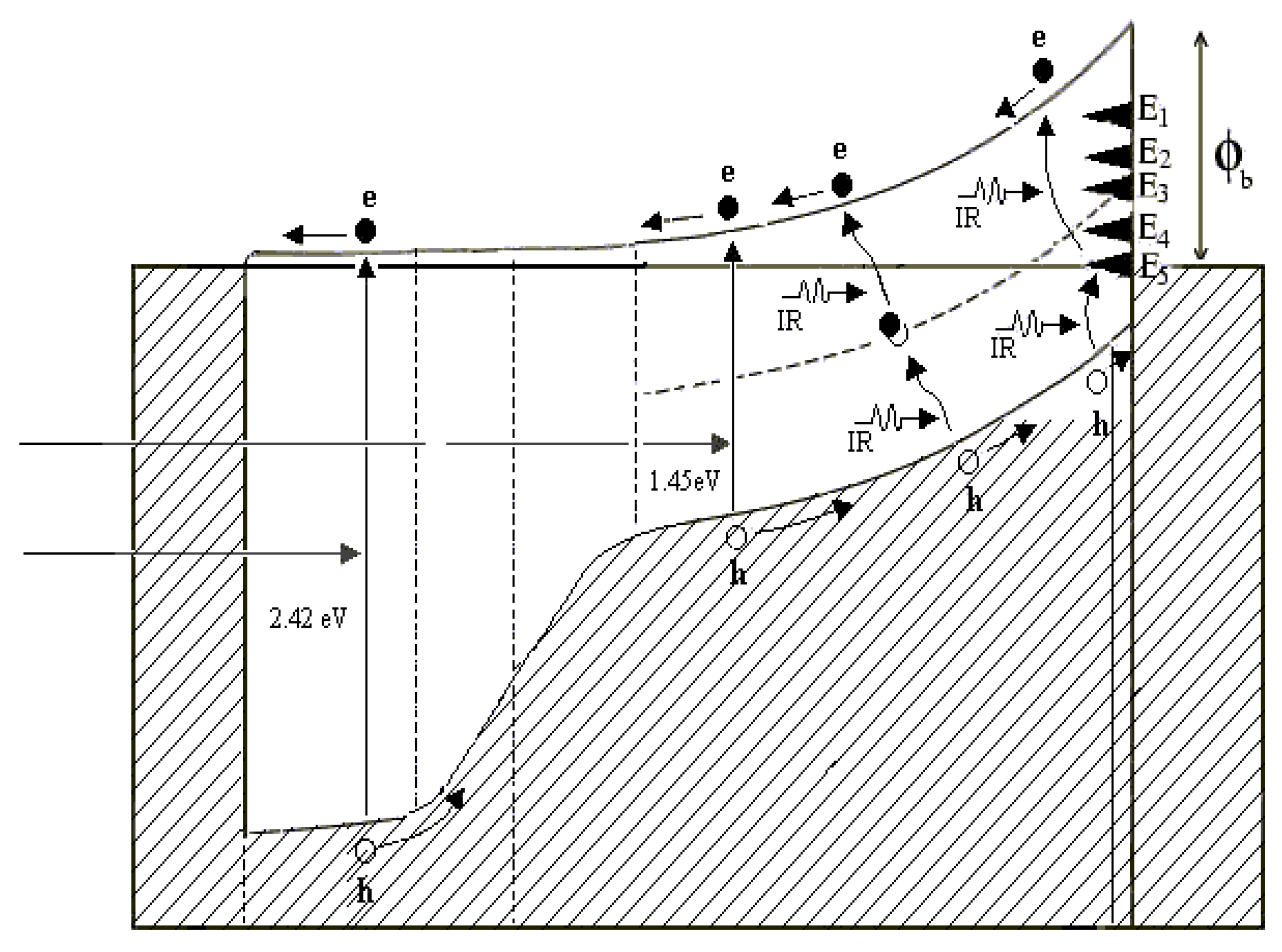 In graded bandgap devices, it is possible to utilise IR-radiation also to create e-h pairs using a multi-step absorption process. This process is shown in both Figure 23 and Figure 25b, and can be considered as the “impurity PV effect”. This is a classic case of utilising naturally occurring defects to the advantages of the device through relevant device designs. This effect has been experimentally observed for graded bandgap devices fabricated using well researched AlGaAs alloy, and recently reported in reference [48]. These devices are capable of producing over 850 mV open circuit voltage under complete darkness, proving the utilisation of IR-radiation from the surroundings. The combination of the use of IR-radiation from the solar spectrum and from the surroundings under normal one-sun illumination is extremely attractive in effective photon harvesting. In this research programme, we observed considerable Voc values under dark conditions indicating the presence of “impurity PV effect” in both CdTe and CIGS thin film solar cells for some devices. Work is in progress to explore these useful phenomena in thin film solar cells.