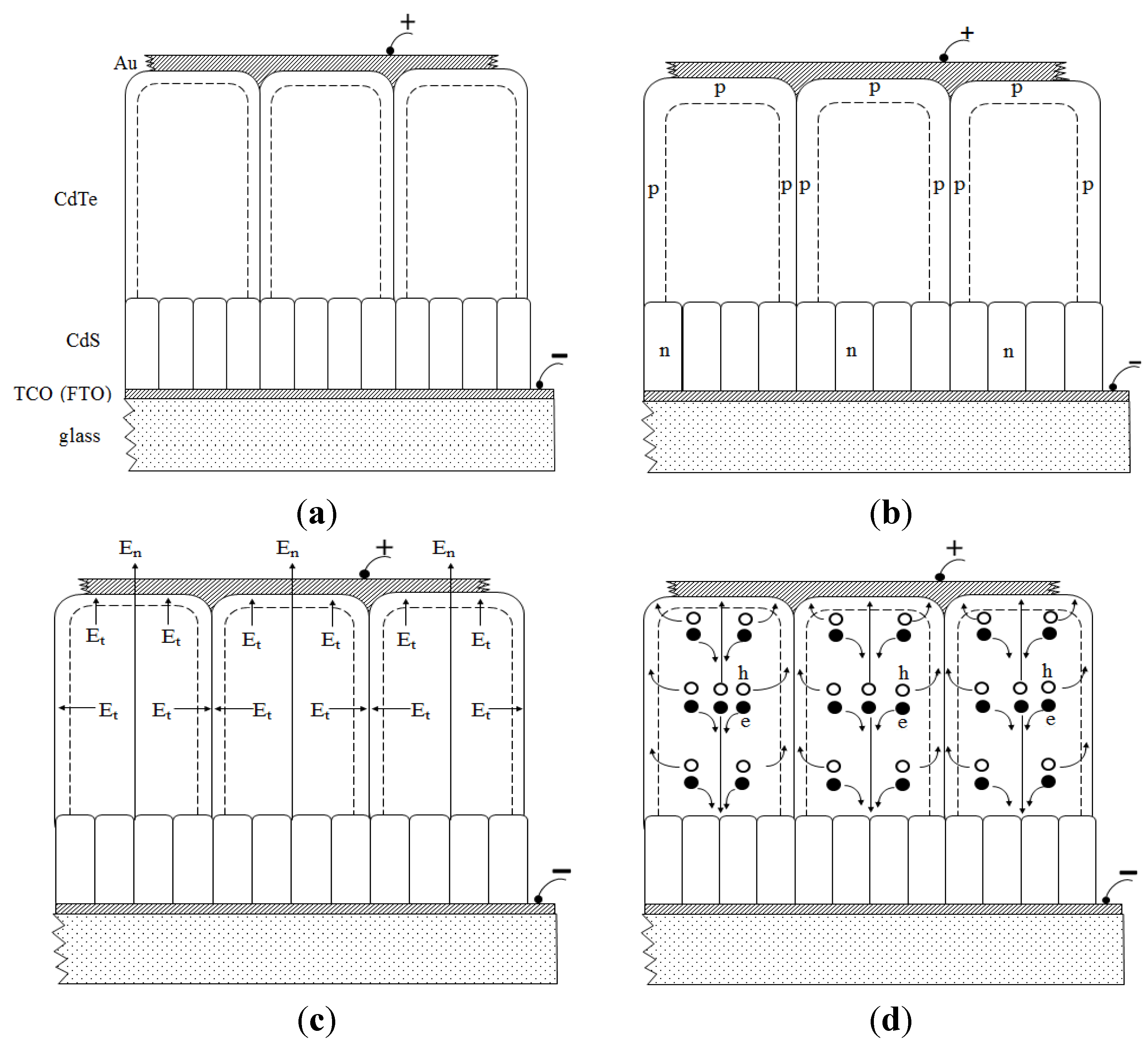 Schematic diagram of (a) rod-type CdS/CdTe solar cells; (b) doping effects of grains after CdCl2 treatment; (c) presence of local electric fields (Et) in addition to the main electric field (En) within the device; and (d) photo-generated charge carrier separation and collection with high current densities along grain boundaries.
