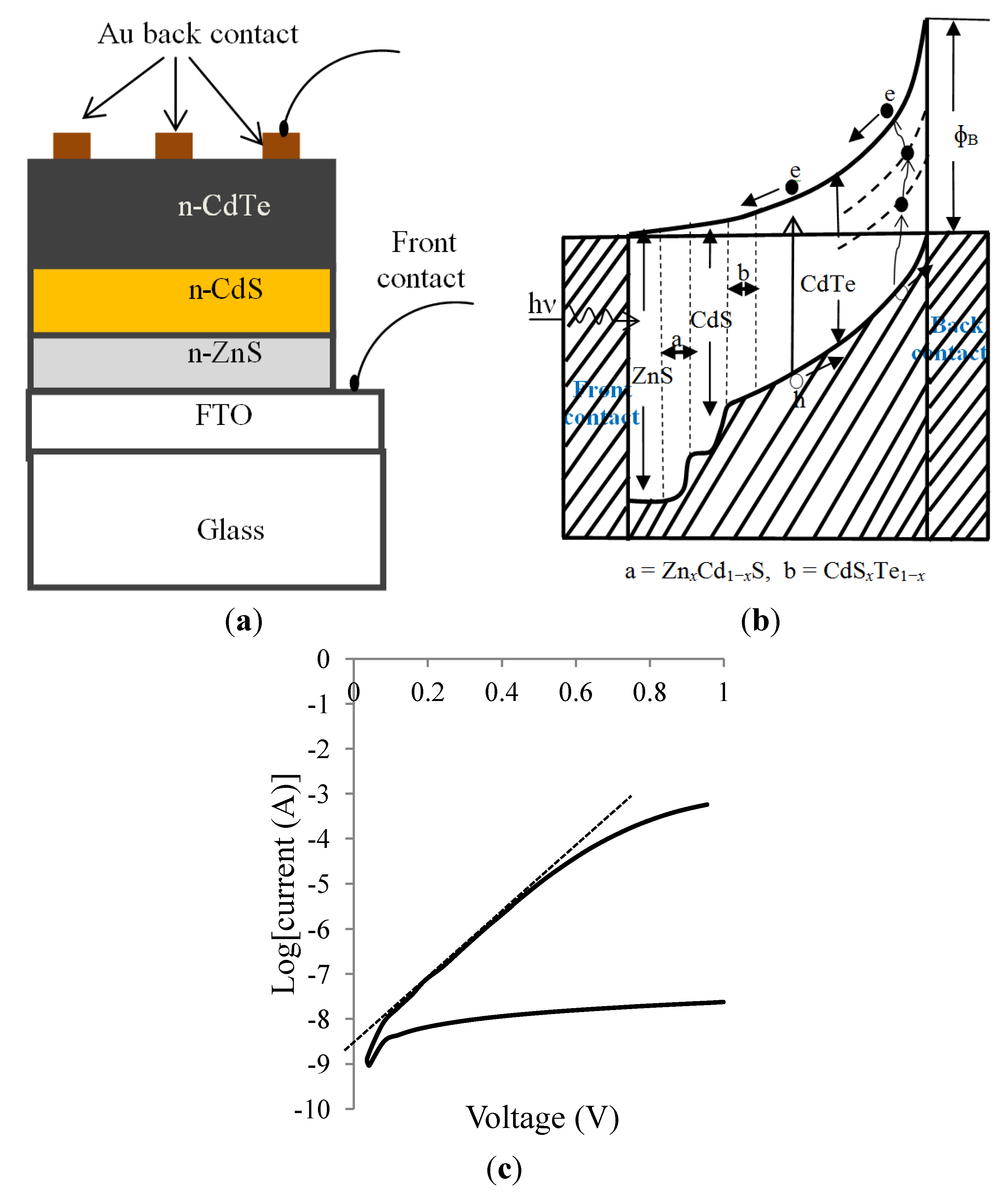 (a) Schematic diagram of a three-layer ZnS/CdS/CdTe graded bandgap solar cell fabricated with n-type materials; (b) its energy band diagram; and (c) the dark current-voltage (I-V) characteristics showing excellent rectification properties.