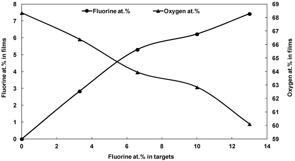 Figure 1 depicts the relationship between the fluorine and oxygen atomic content incorporated in the film, both as a function of the fluorine content of the target. It was observed that the fluorine to oxygen ratio increased with the increase in the fluorine content in the thin film. This indicates that the fluorine was successfully incorporated into the tin oxide, as each F− anion substitutes an O2− anion in the lattice. This is attributed to the fact that fluorine is the most favored oxygen substitute, because the ionic size of fluorine (F−:0.133 nm) is closely matched to that of oxygen (O2−:0.132 nm) [].