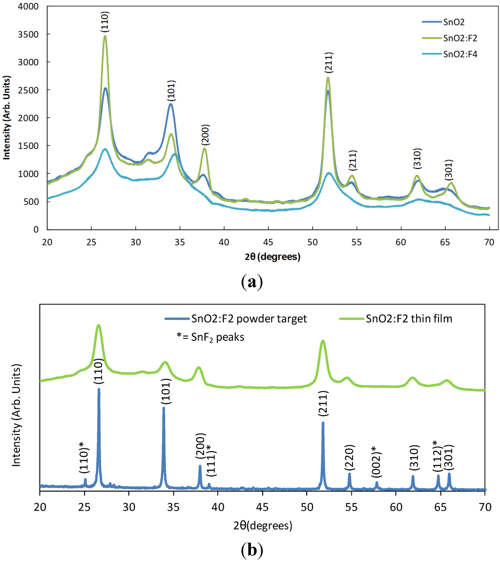 X-ray diffraction patterns showing the (a) effect of doping on the crystallography of SnO2, SnO2:F2 and SnO2:F4 thin film samples on glass substrates, and (b) the comparison between the spectra of the SnO2:F2 bulk powder target and the SnO2:F2 thin film sample.